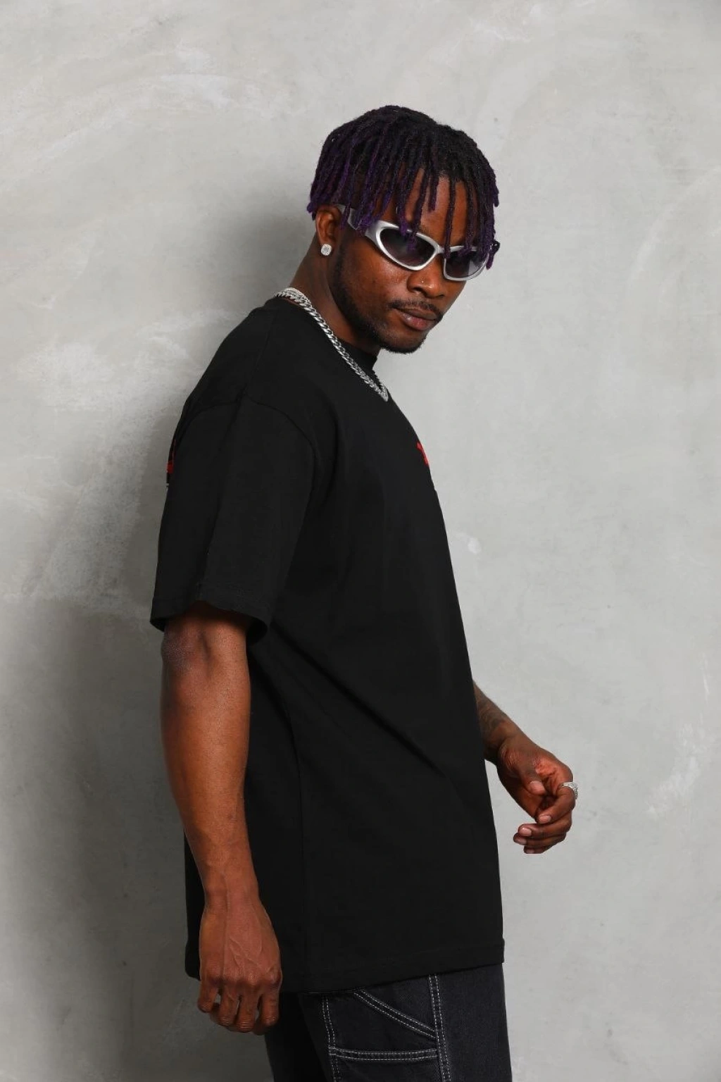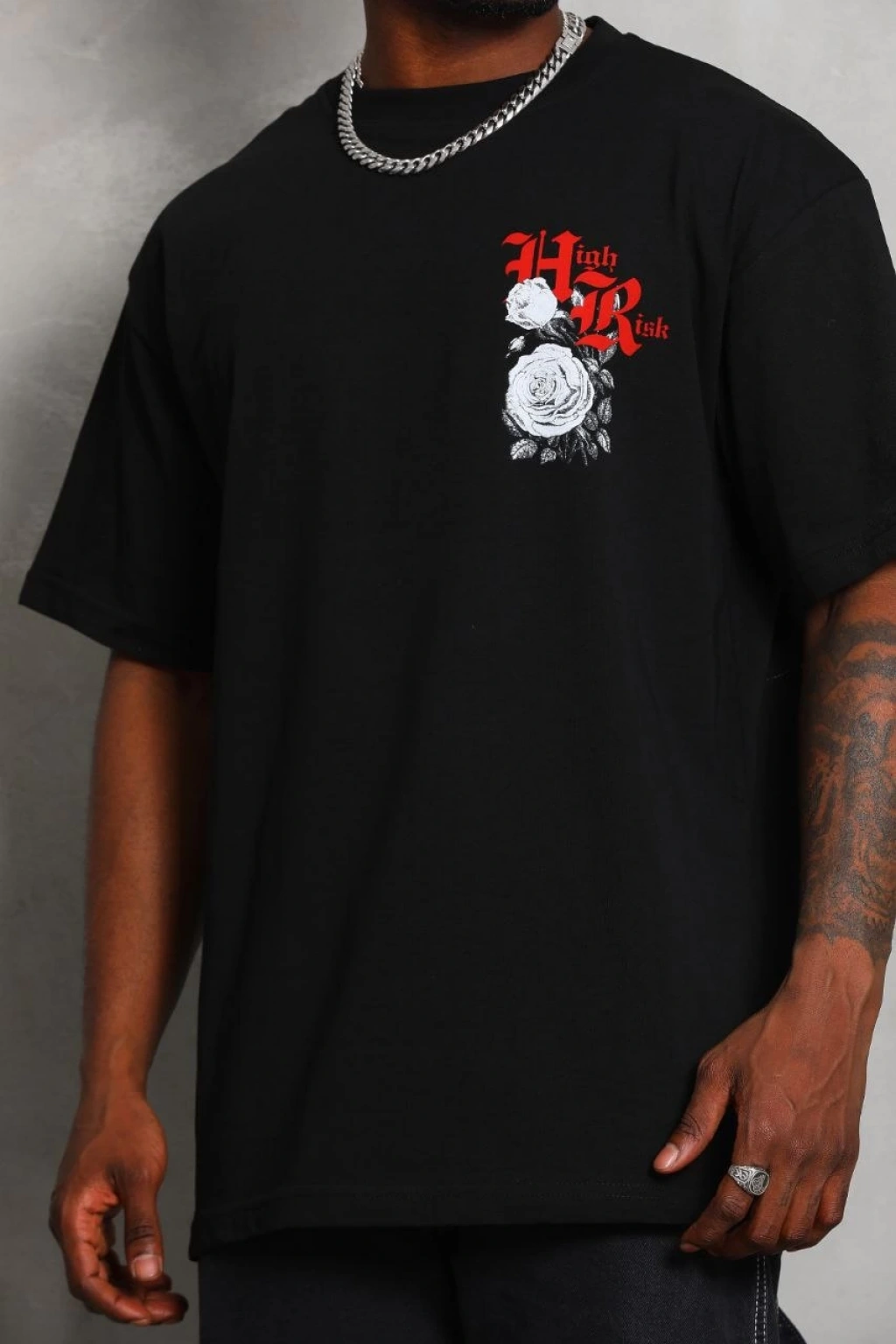 Oversize Baskılı Bisiklet Yaka T-Shirt - Siyah -
