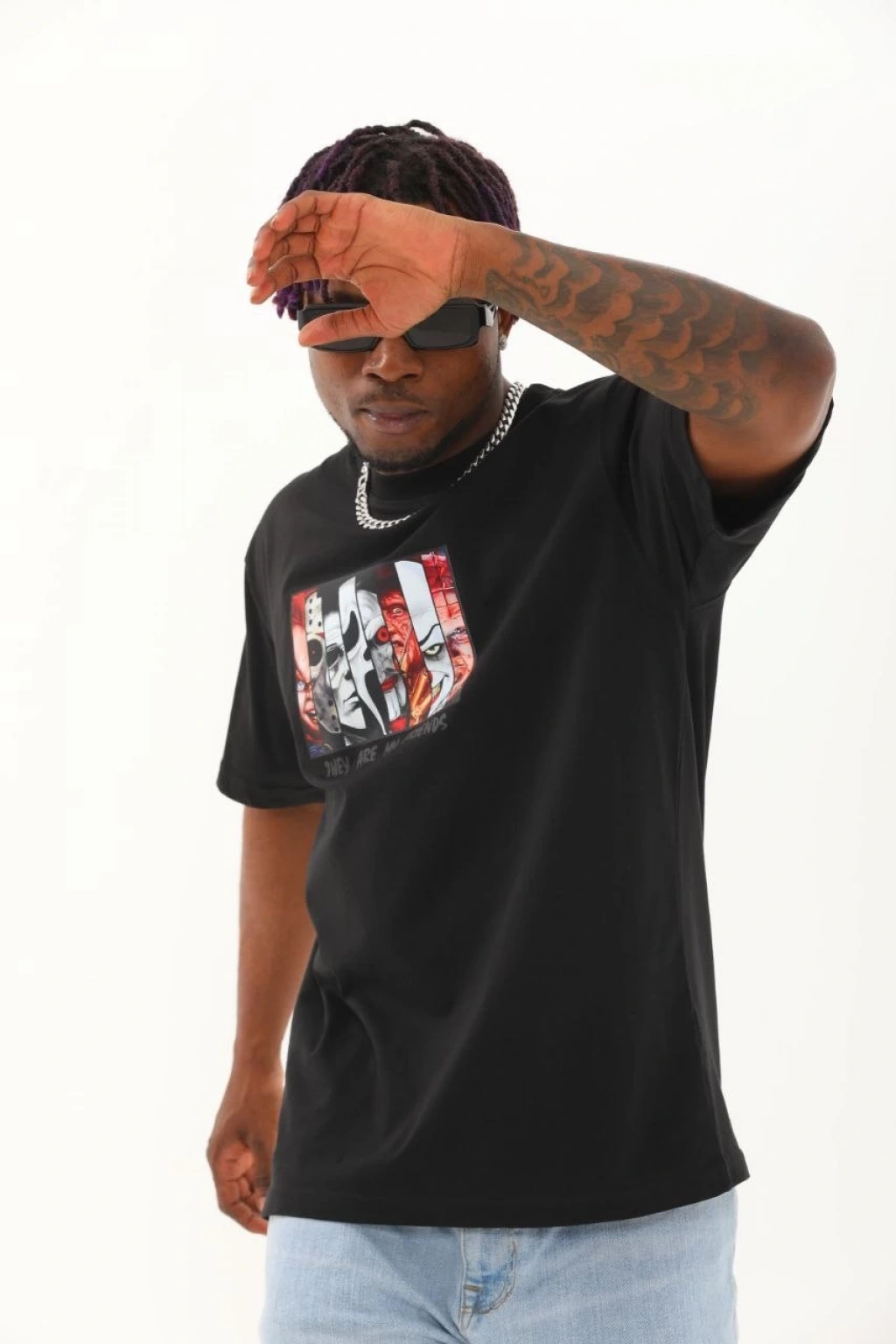 Oversize Baskılı Bisiklet Yaka T-Shirt - Siyah -