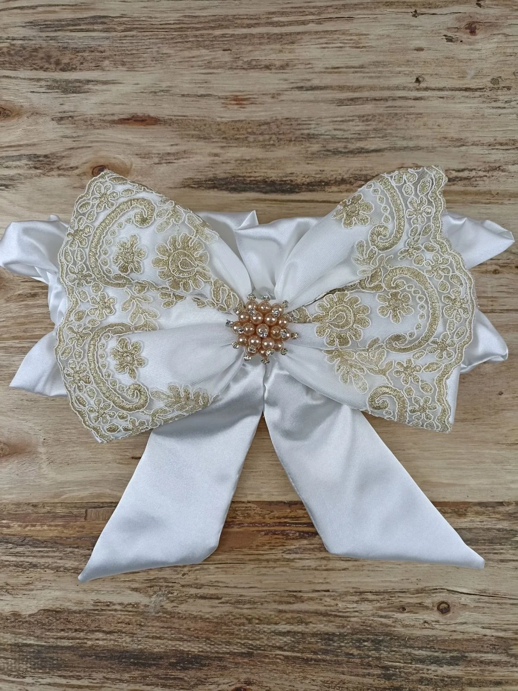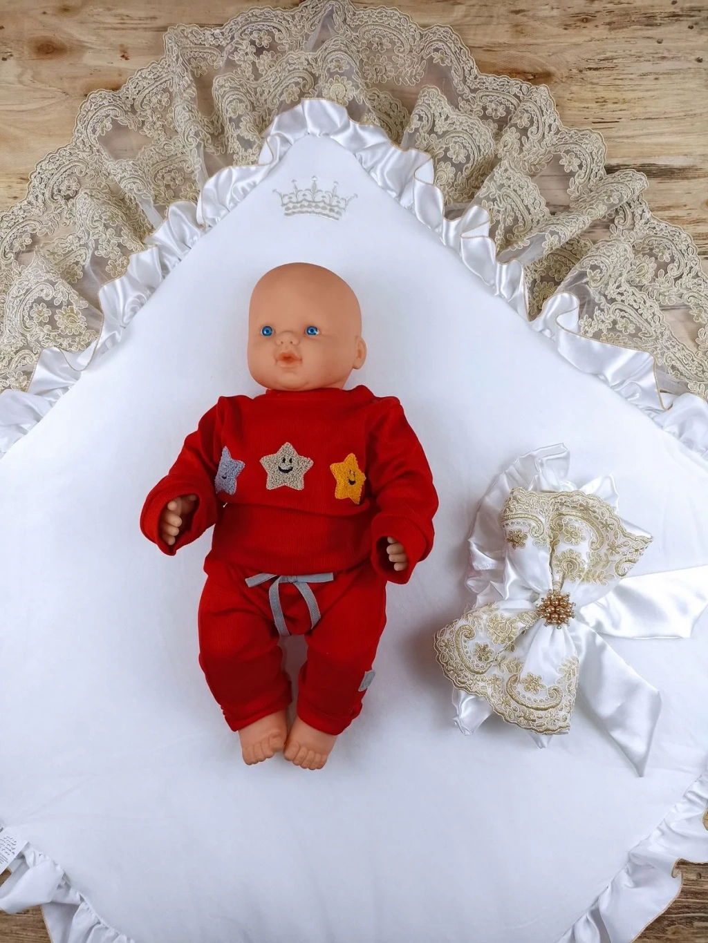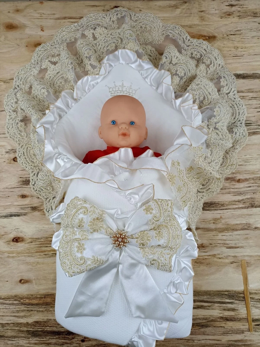 Sahra Taç Nakışlı İnci Ve Dantel Fiyonklu Çift Dantel Duvaklı Trilüks Kundak Bebek Battaniyesi Gold