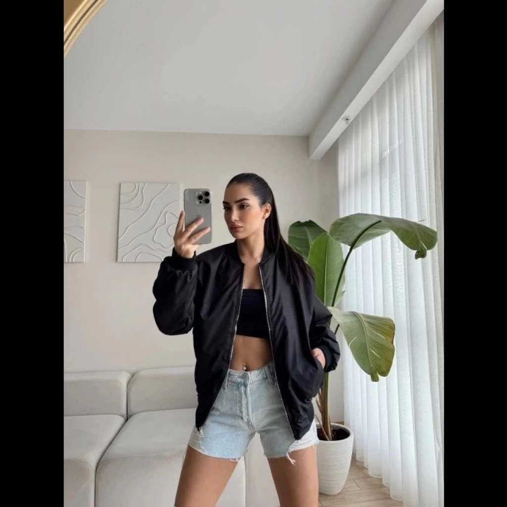 Kadın Mikro Su İtici Kapitone Baskılı Astarlı Fermuarlı Bomber Mont - Siyah