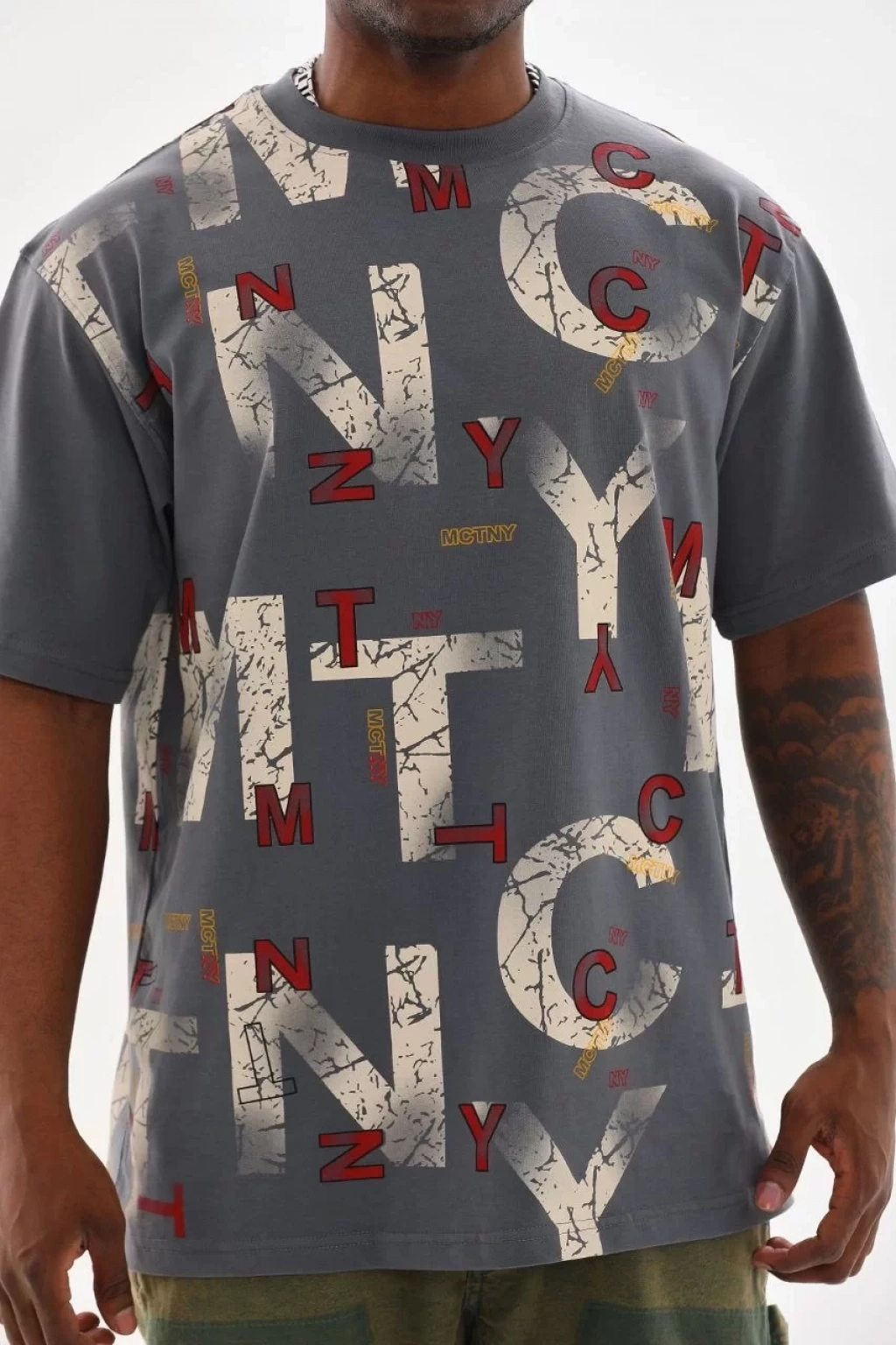 Erkek OversizeGrafik Tişört "CAMPBRASTCOOPERATION" Kalın Yazı Bisiklet Yaka, Kısa Kol, Kalın Mor ve Siyah Desenli Yazlık Sokak Kıyafeti - Siyah