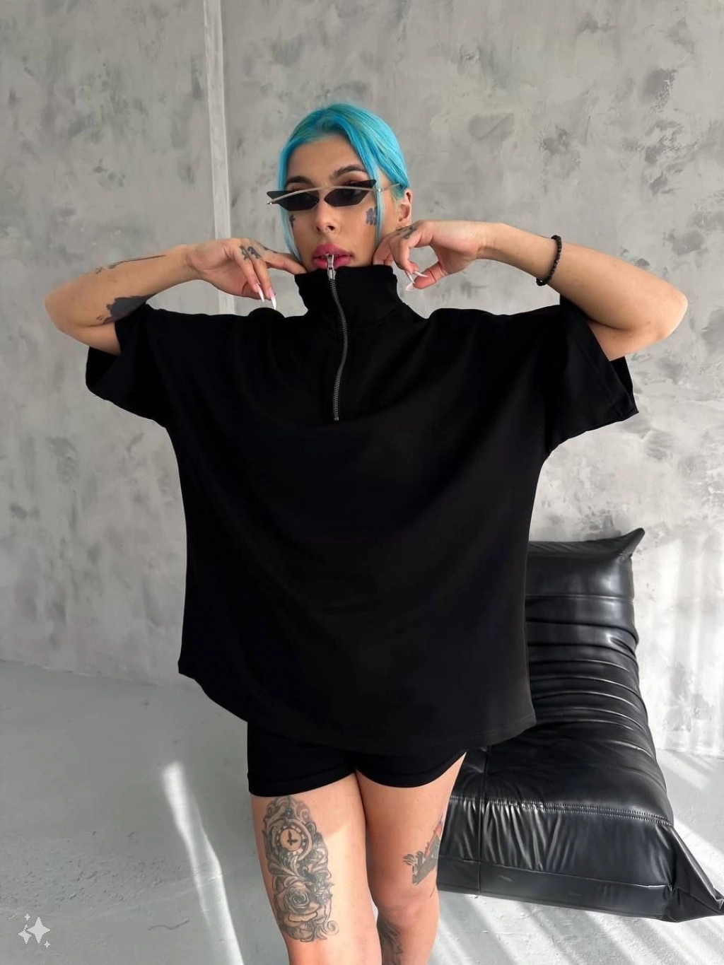 Yarım Fermuarlı Basic T-Shirt - Siyah -