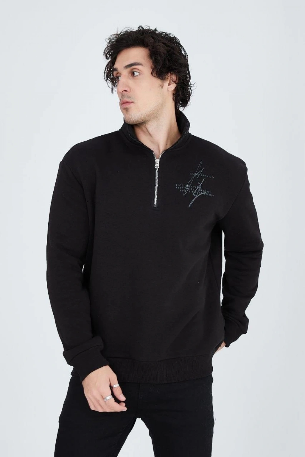 Yarım Fermuarlı Baskılı Sweat - Siyah