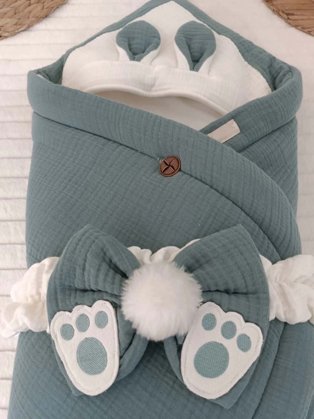 Yenidoğan 4 Kat Müslin Kumaş Kulaklı Patili Fiyonk Bebek Battaniyesi Kundak Kahverengi