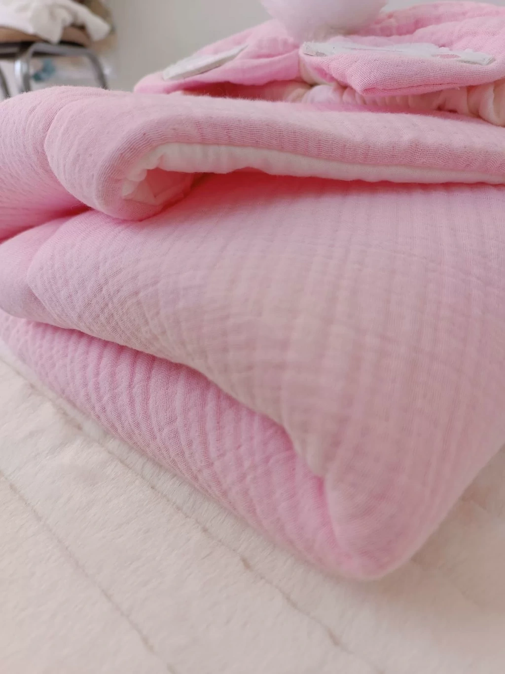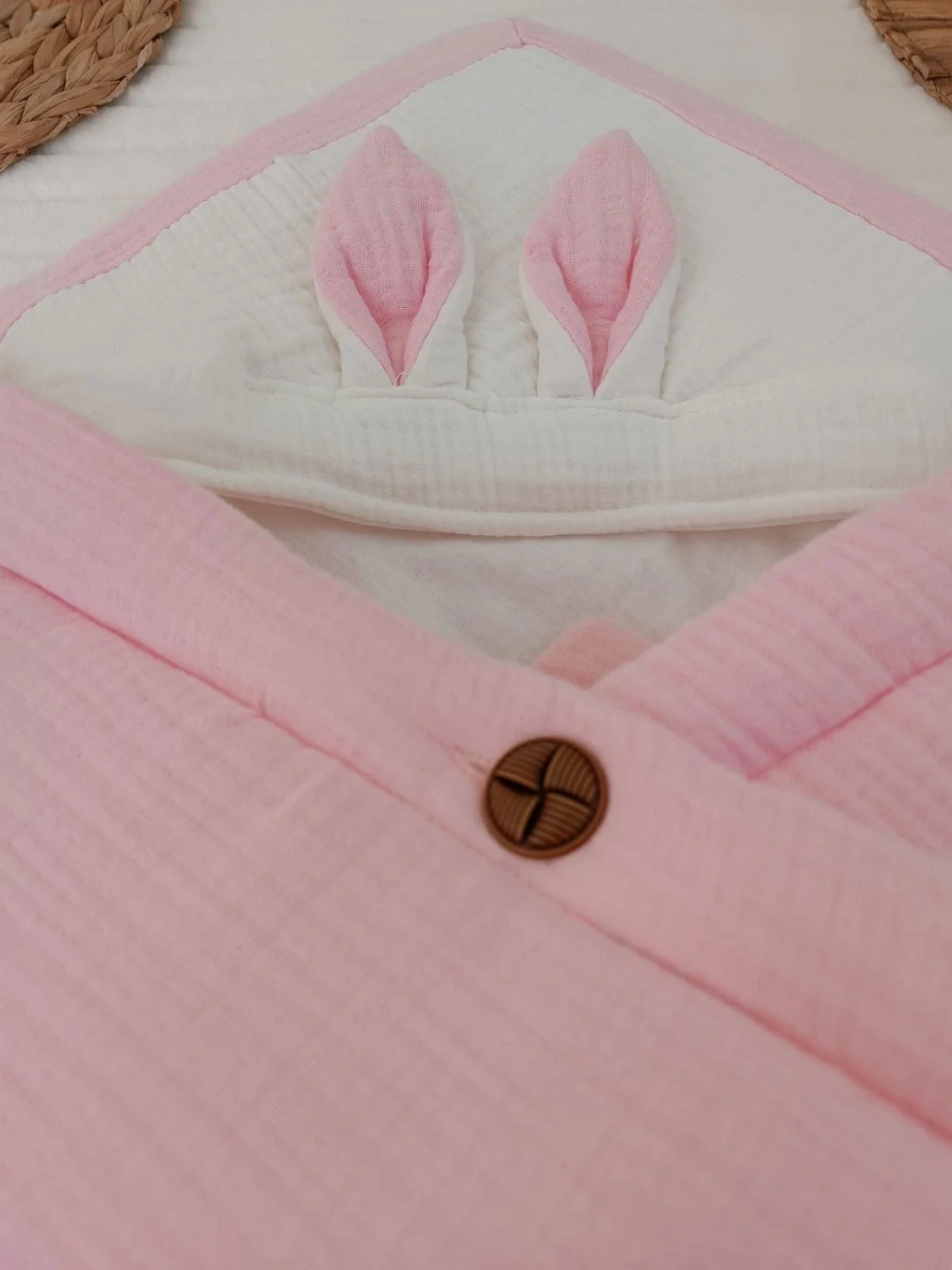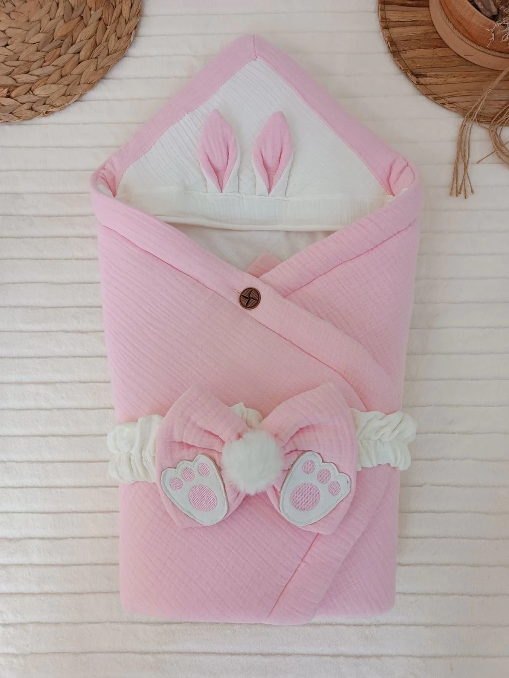 Yenidoğan 4 Kat Müslin Kumaş Kulaklı Patili Fiyonk Bebek Battaniyesi Kundak Pembe