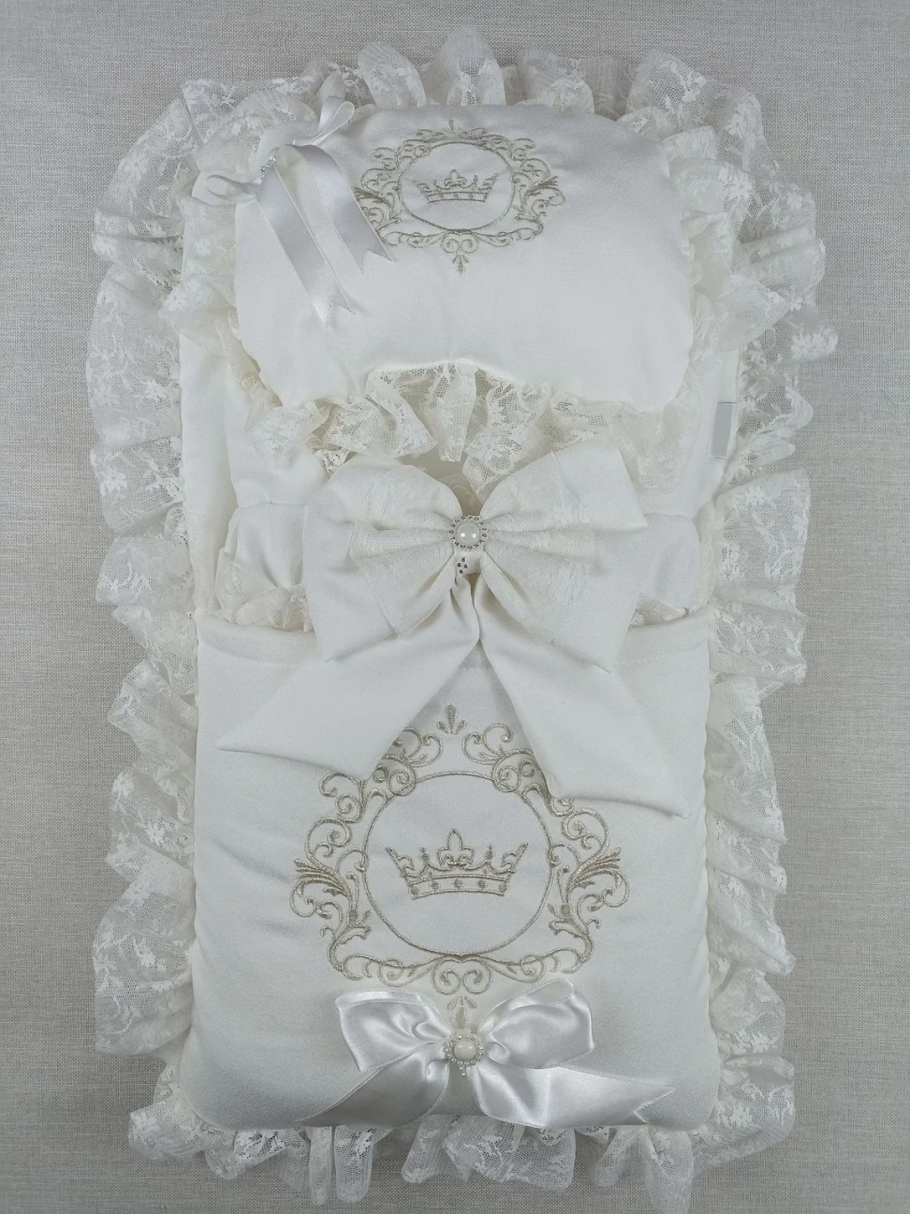 Yenidoğan Antalya Taç Nakışlı Kundaklı Trilüks Unisex 3lü Alt Açma Seti Ekru