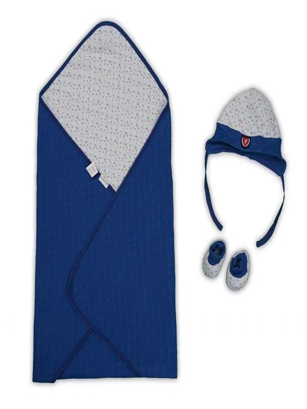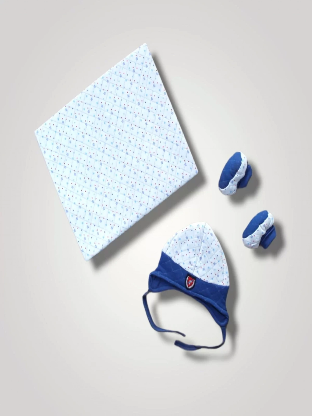Yenidoğan Baskılı Double Face Şapka Ve Patikli 3lü Bebek Battaniye Takımı Lacivert