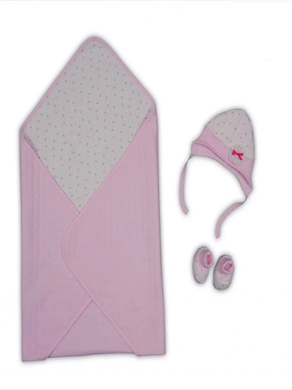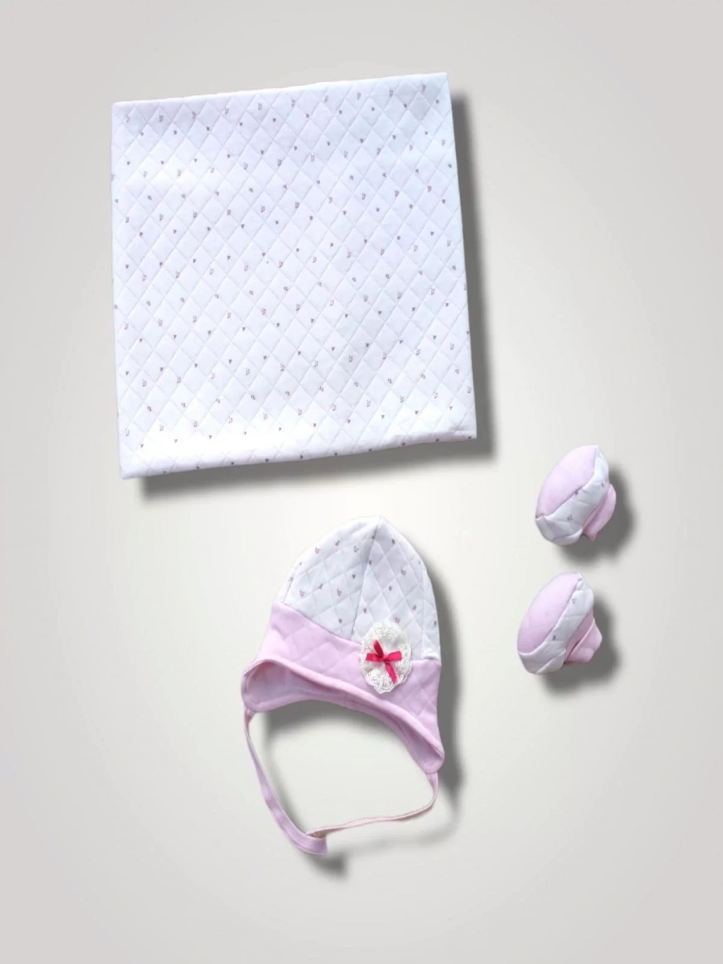Yenidoğan Baskılı Double Face Şapka Ve Patikli 3lü Bebek Battaniye Takımı Pembe