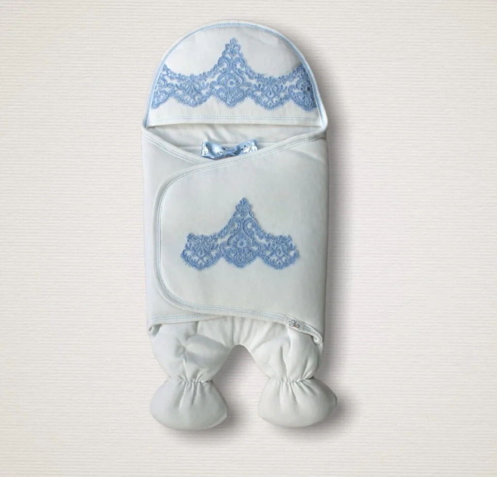 Yenidoğan Fistolu Fiyonk Kurdelalı Şapkalı Lüks Kız Erkek Bebek Ayaklı Kundak Bebek Battaniyesi Mavi