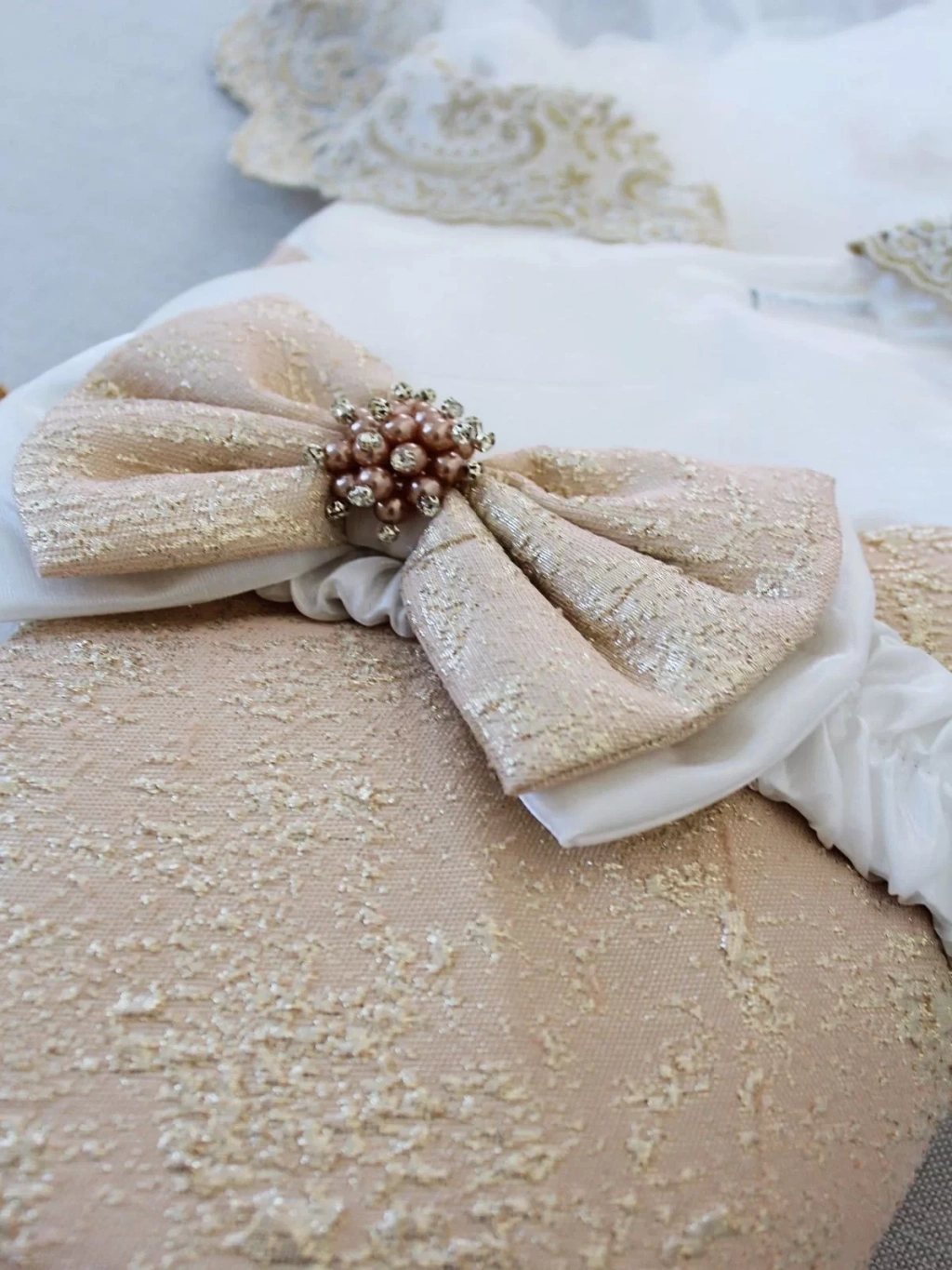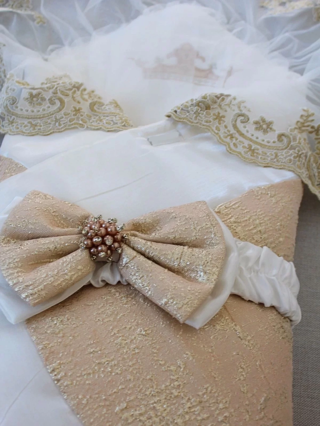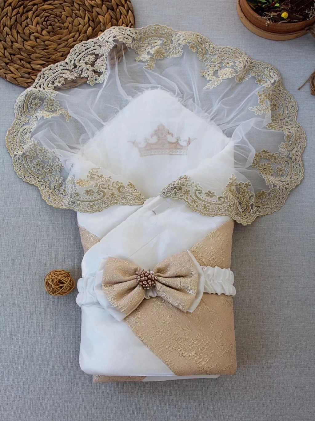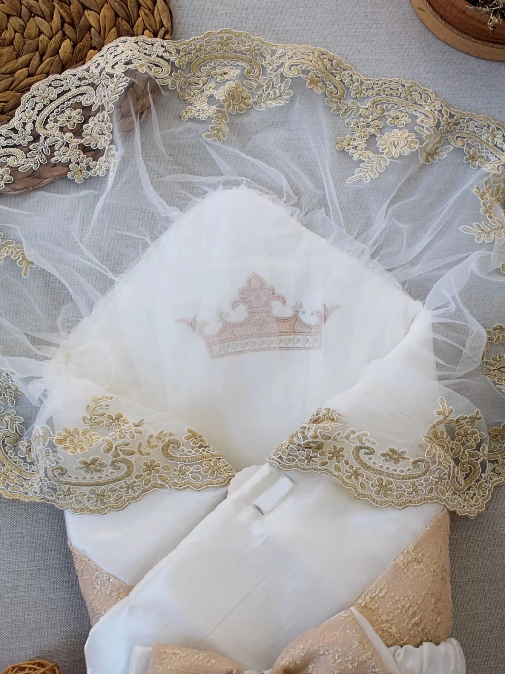 Yenidoğan Gold Zümrüt Taşlı Prizma Taç Nakışlı Lüks Duvaklı Kumru Kundak Bebek Battaniyesi Gold