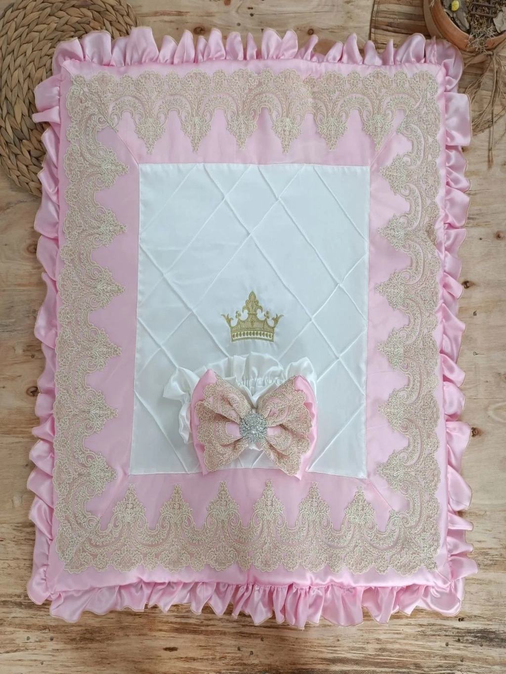 Yenidoğan Grand Lüks Kelebek Ağır Güpür İşlemeli Şapkalı Bebek Battaniyesi Kundak Pembe