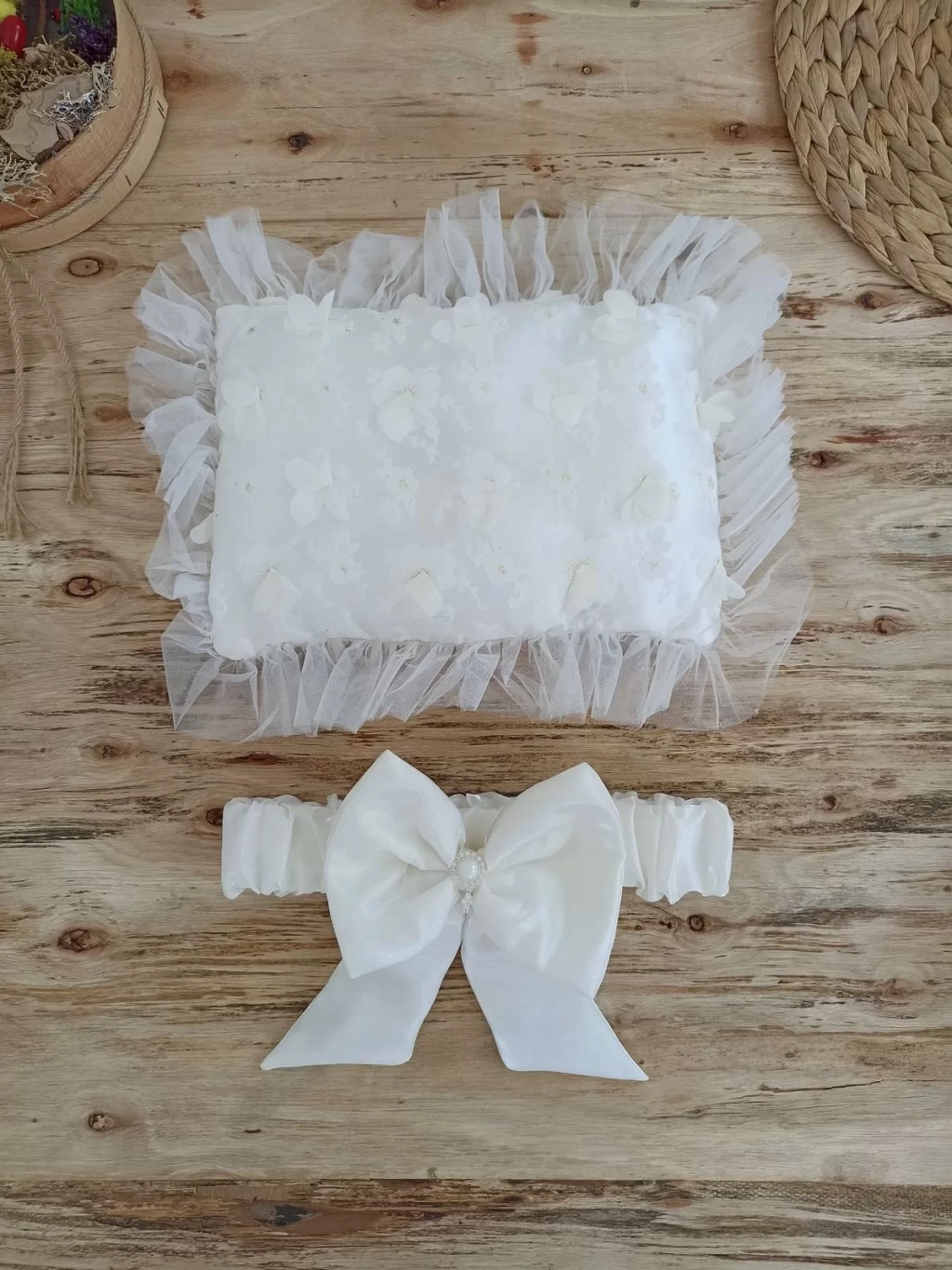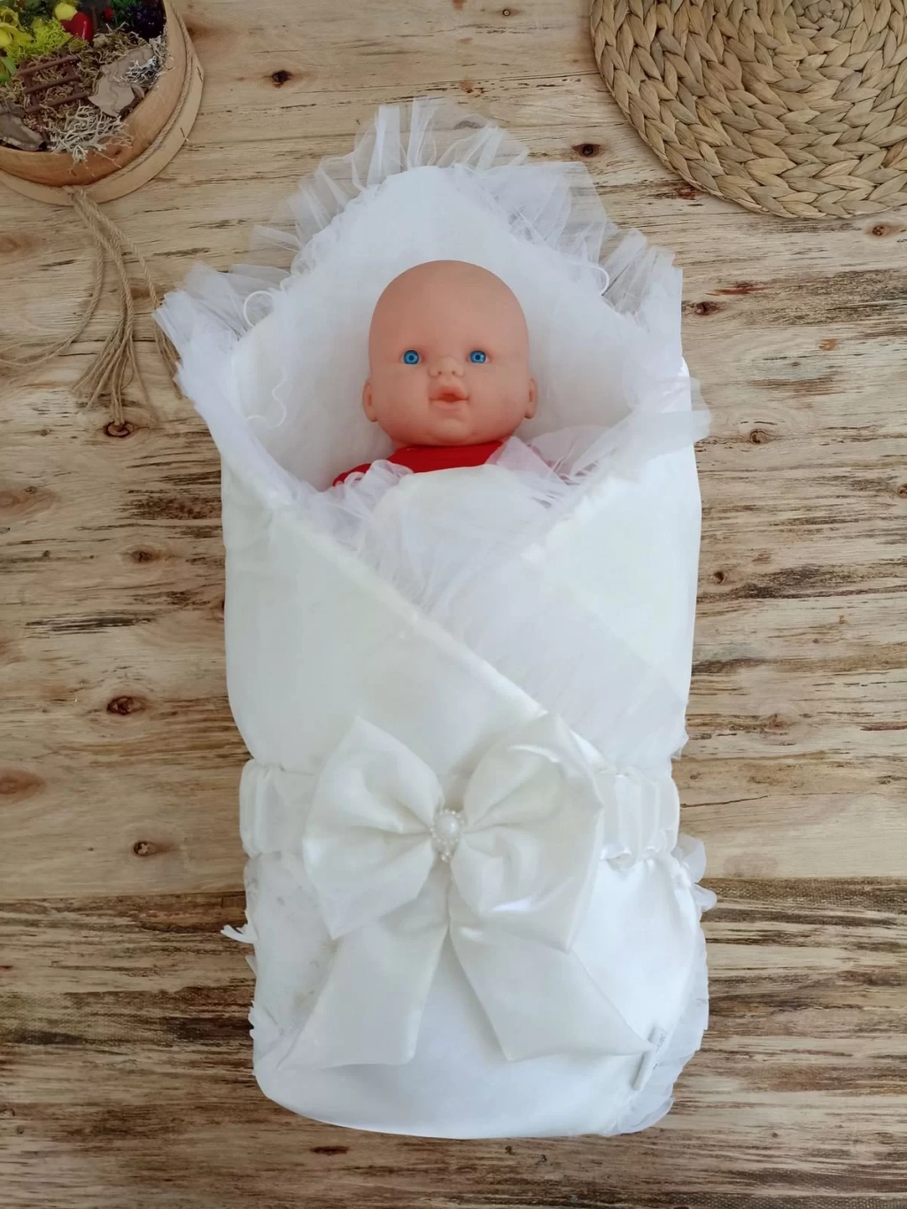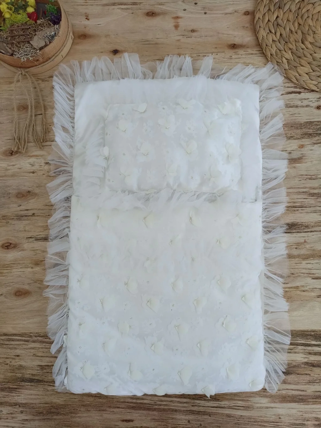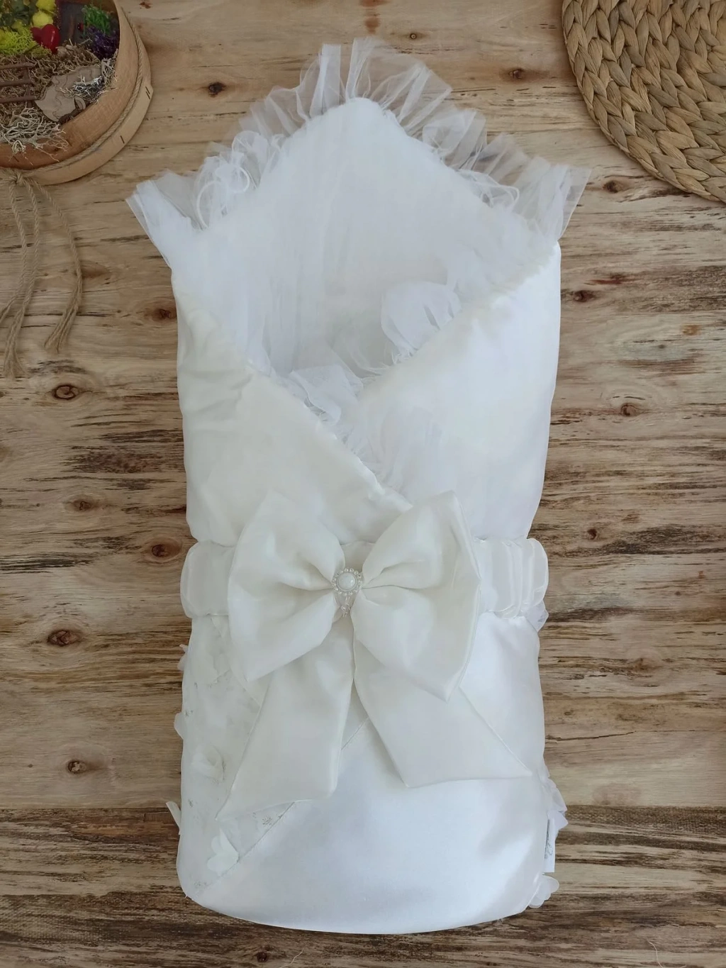 Yenidoğan İzmir İncisi Tül İşlemeli Pamuklu Fiyonklu Kundaklı Lüks 3lü Alt Açma Seti Ekru