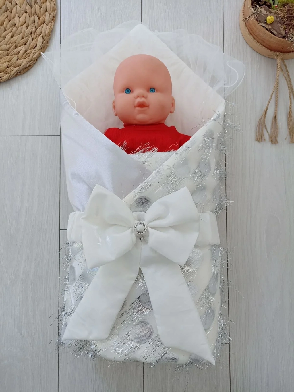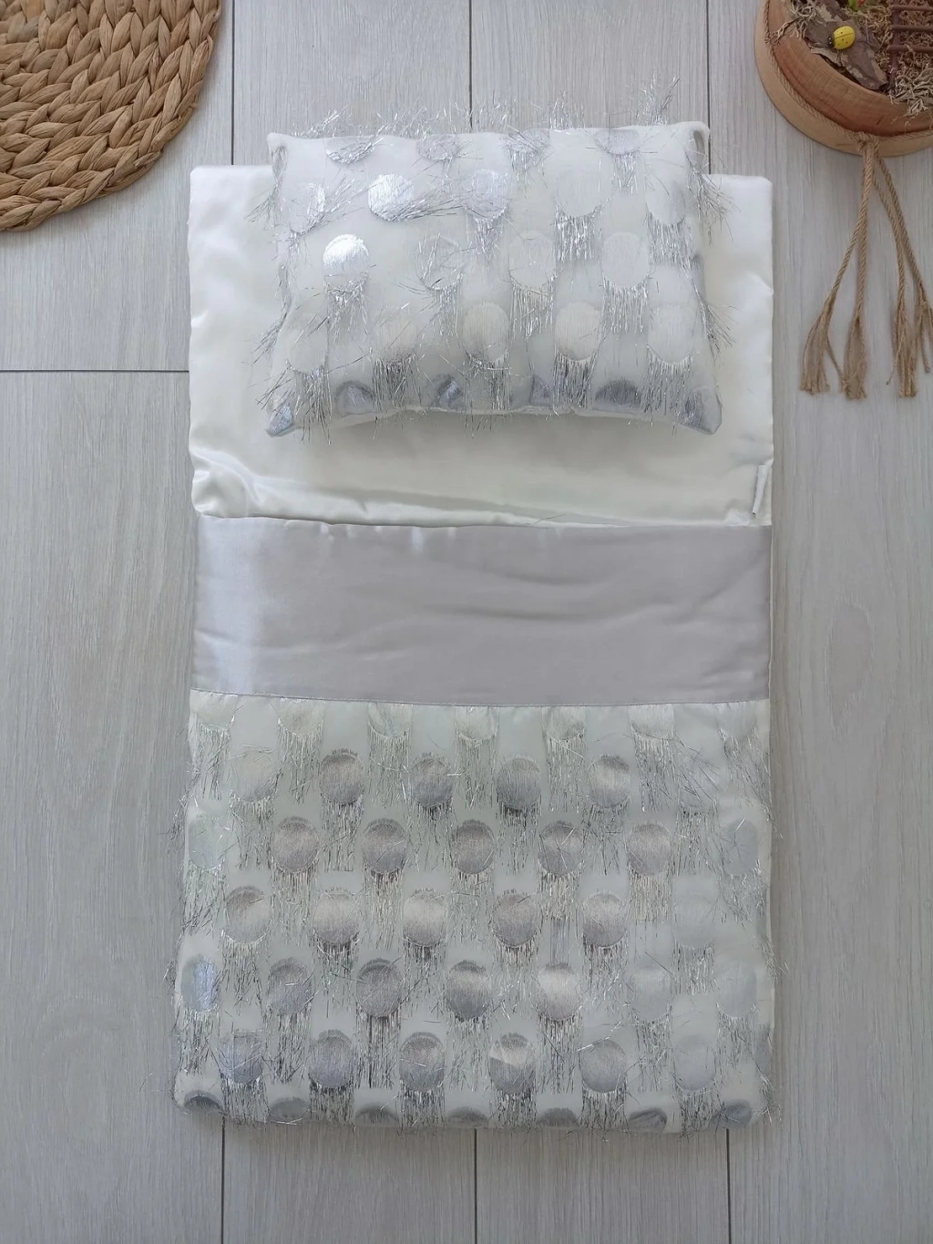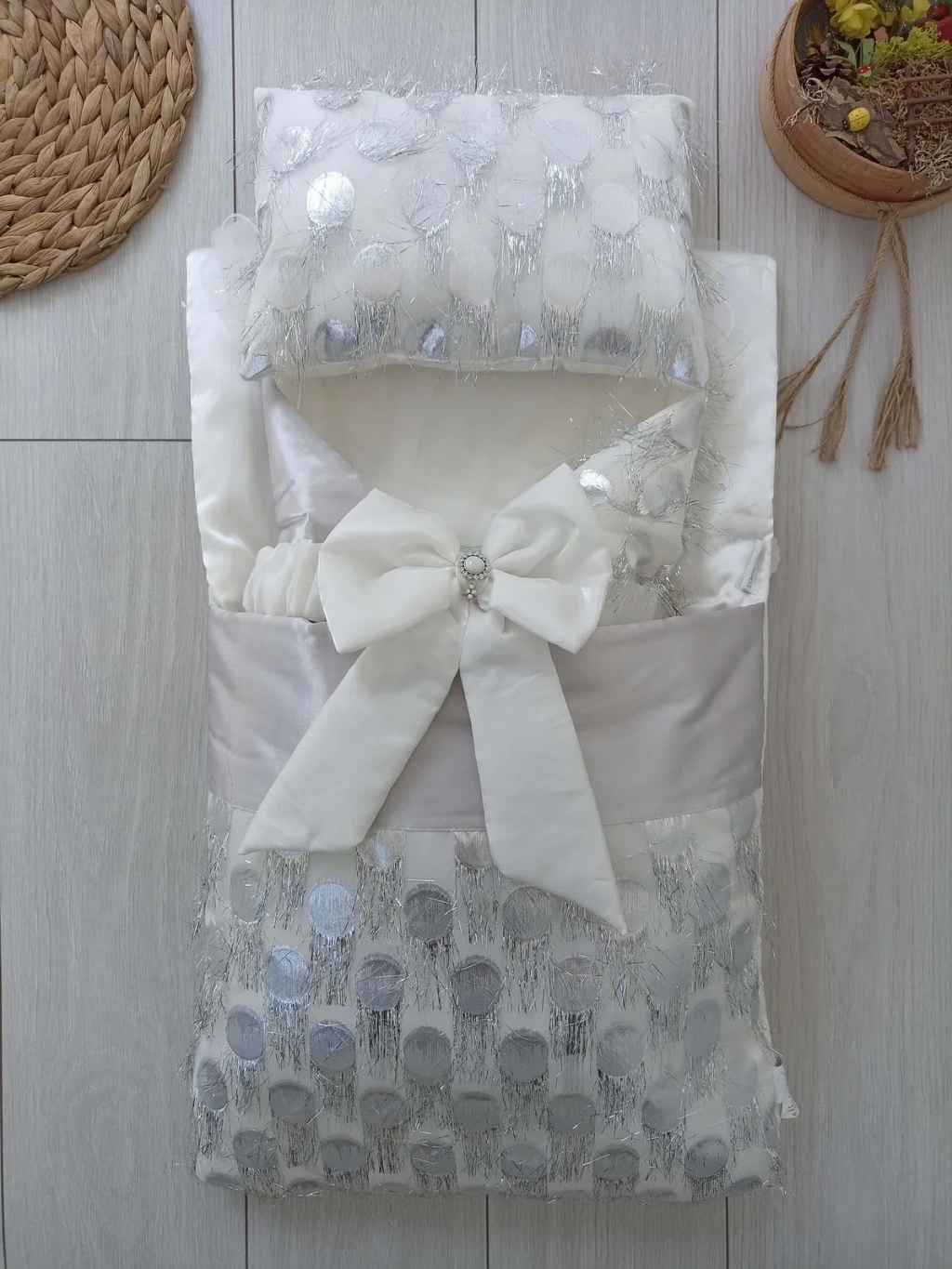 Yenidoğan İzmir İncisi Tül İşlemeli Pamuklu Fiyonklu Kundaklı Lüks 3lü Alt Açma Seti Gümüş