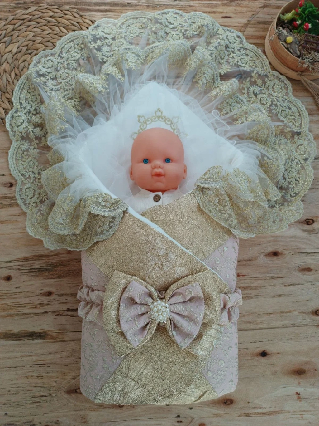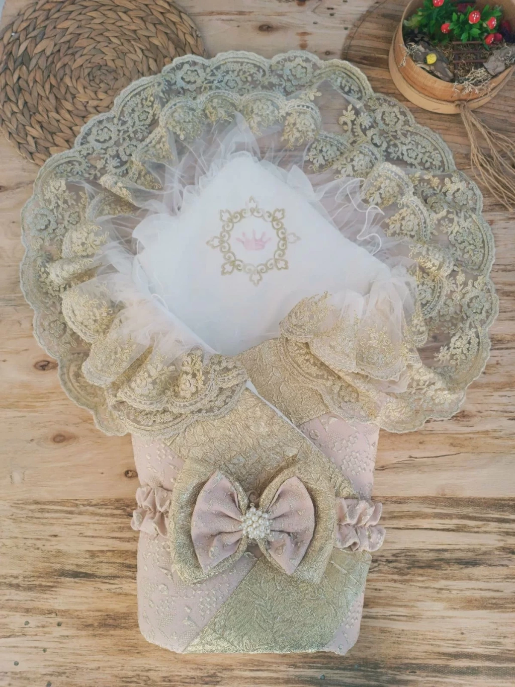 Yenidoğan Kabartma Desenli Gold Çift Güpürlü Ve Fiyonklu Bebek Battaniyesi Kundak Gold