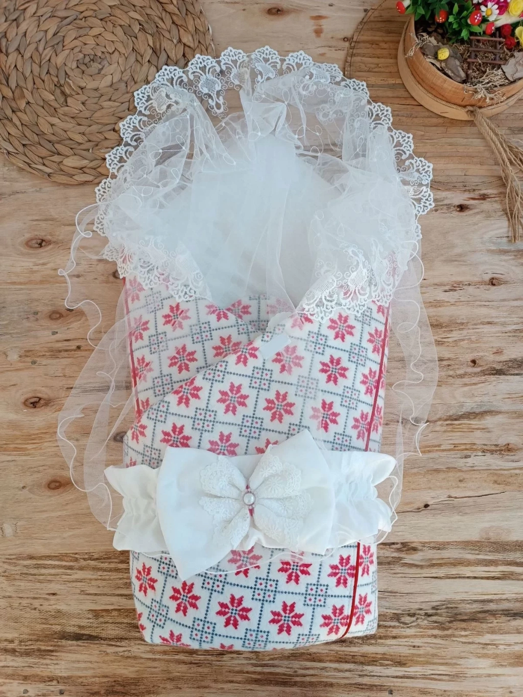 Yenidoğan Kar Tanesi Desenli Dantelli Duvaklı Bebek Battaniyesi Kundak Ekru