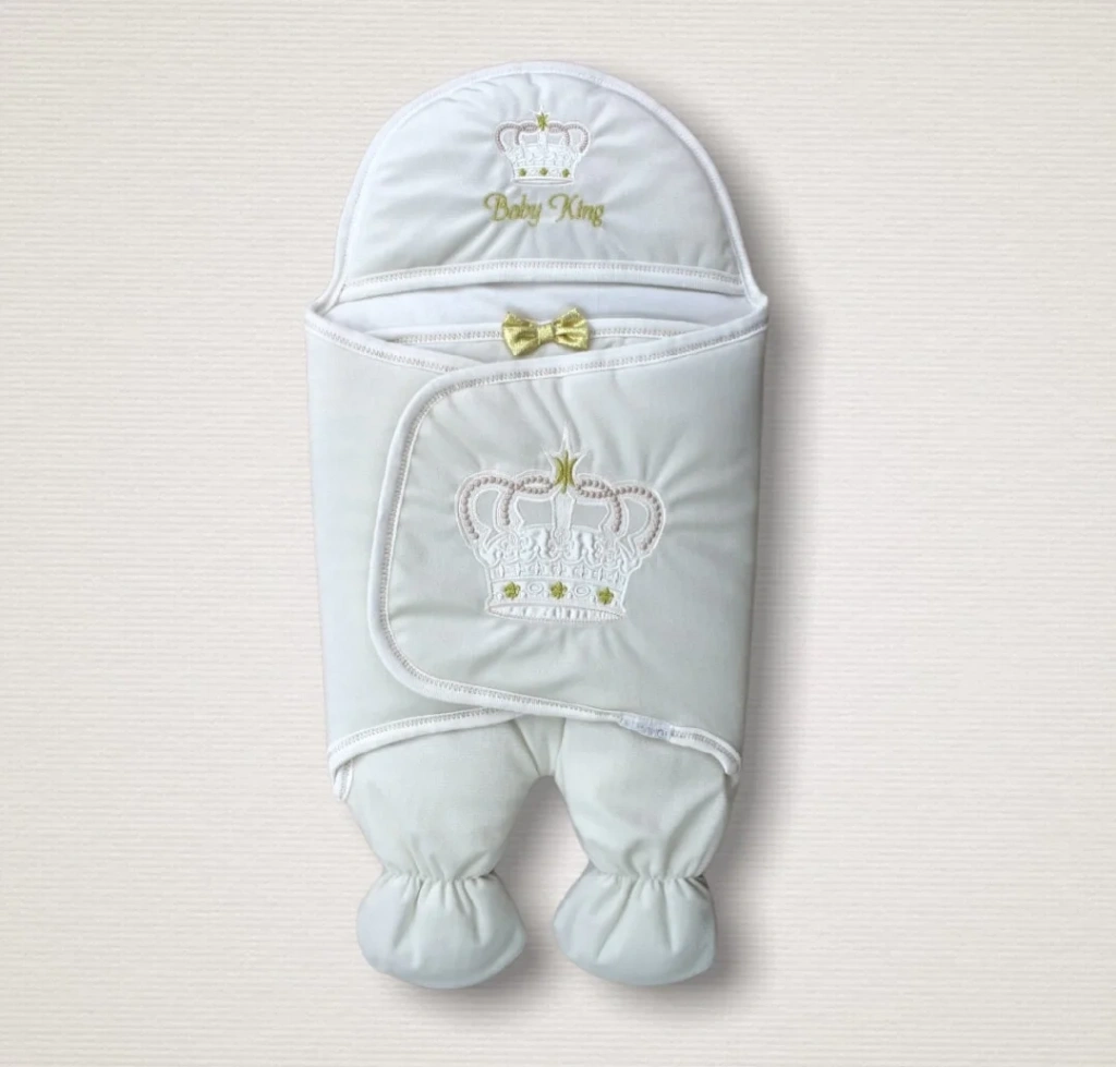 Yenidoğan King Baby Taç Nakışlı Ayaklı Erkek Bebek Kundak Ekru