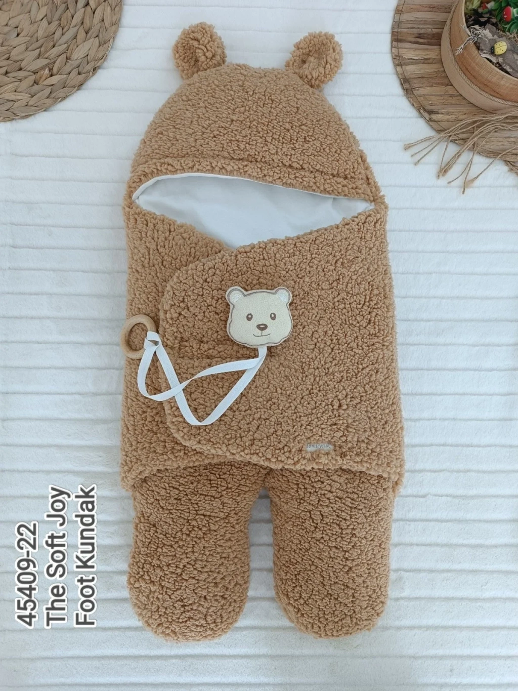 Yenidoğan Kulaklı Şapkalı Açılır Kucaklı Cırt Kapamalı Ayaklı Bebek Battaniyesi Kundak Kahverengi