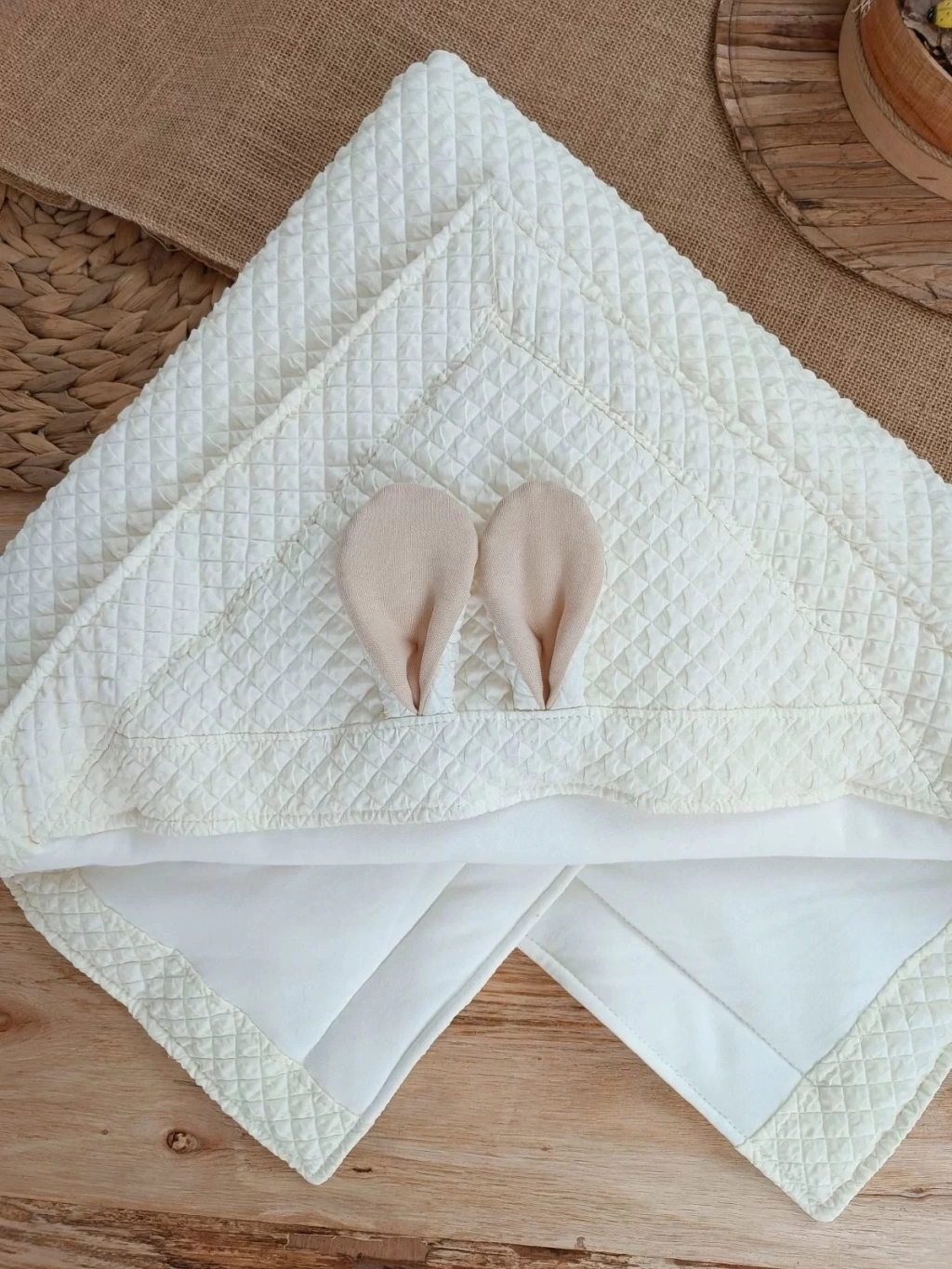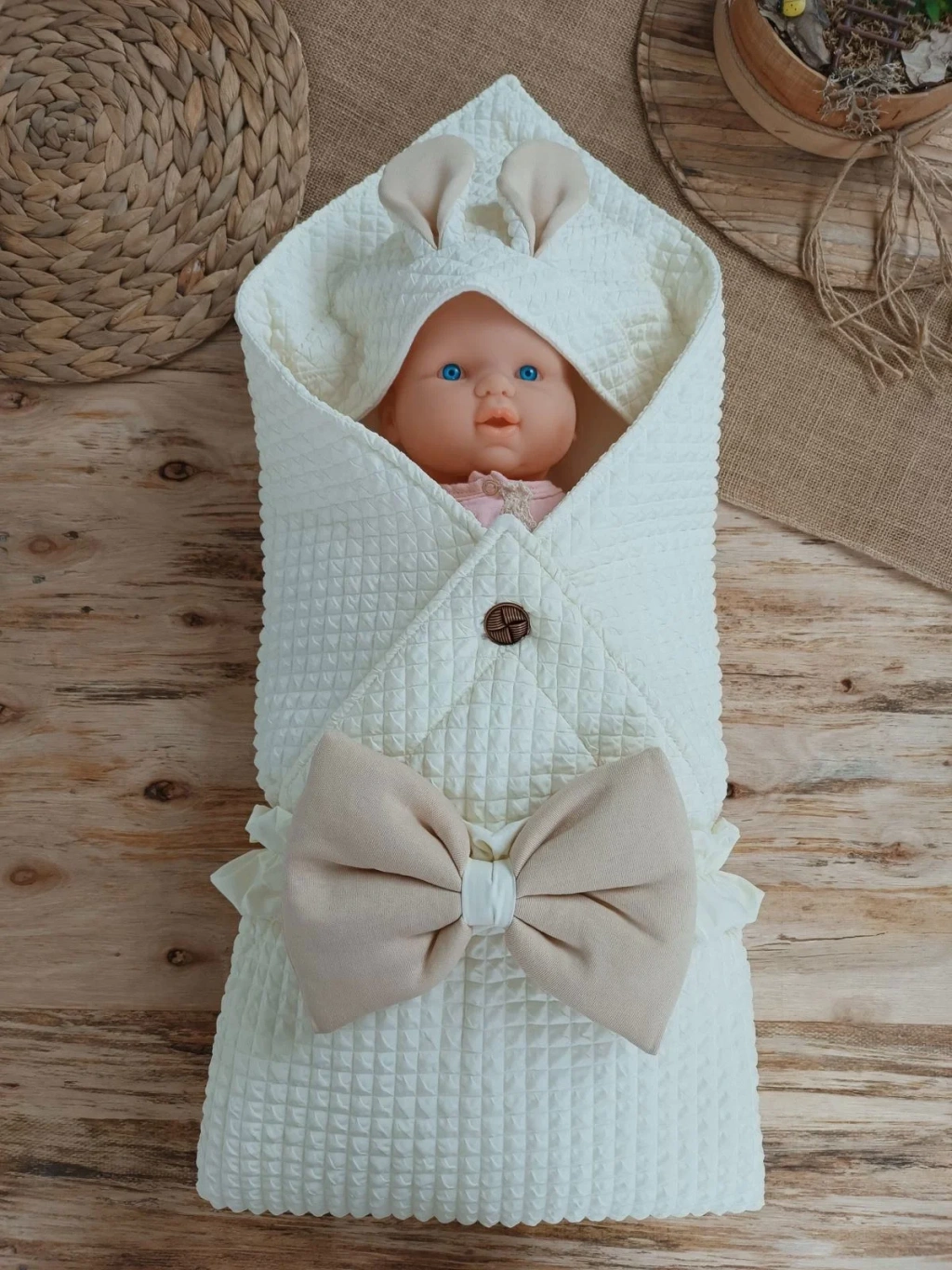 Yenidoğan Kulaklı Şapkalı Düğme Detaylı Fiyonklu Bebek Battaniyesi Kundak Krem