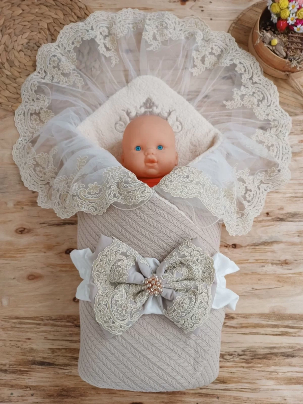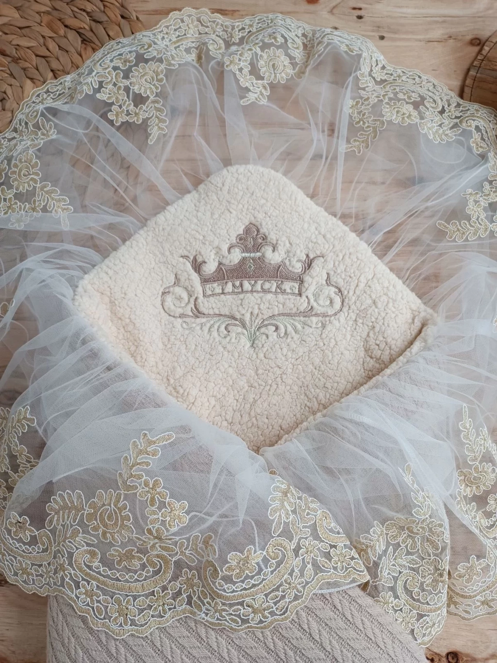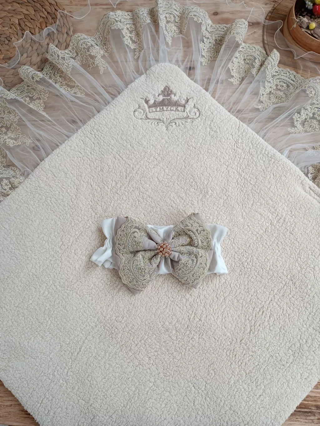 Yenidoğan Kuzulu Taç Nakış Güpürlü Fiyonklu Duvaklı Prizma Taş Unisex Kundak Bebek Battaniyesi Bej