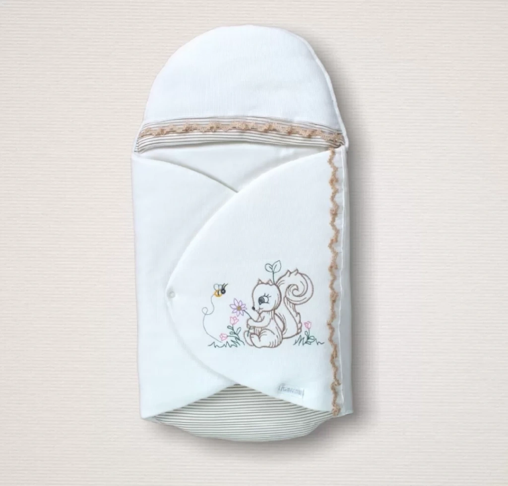 Yenidoğan Minik Sincap Nakışlı Kundak Kız Bebek Battaniyesi Ekru
