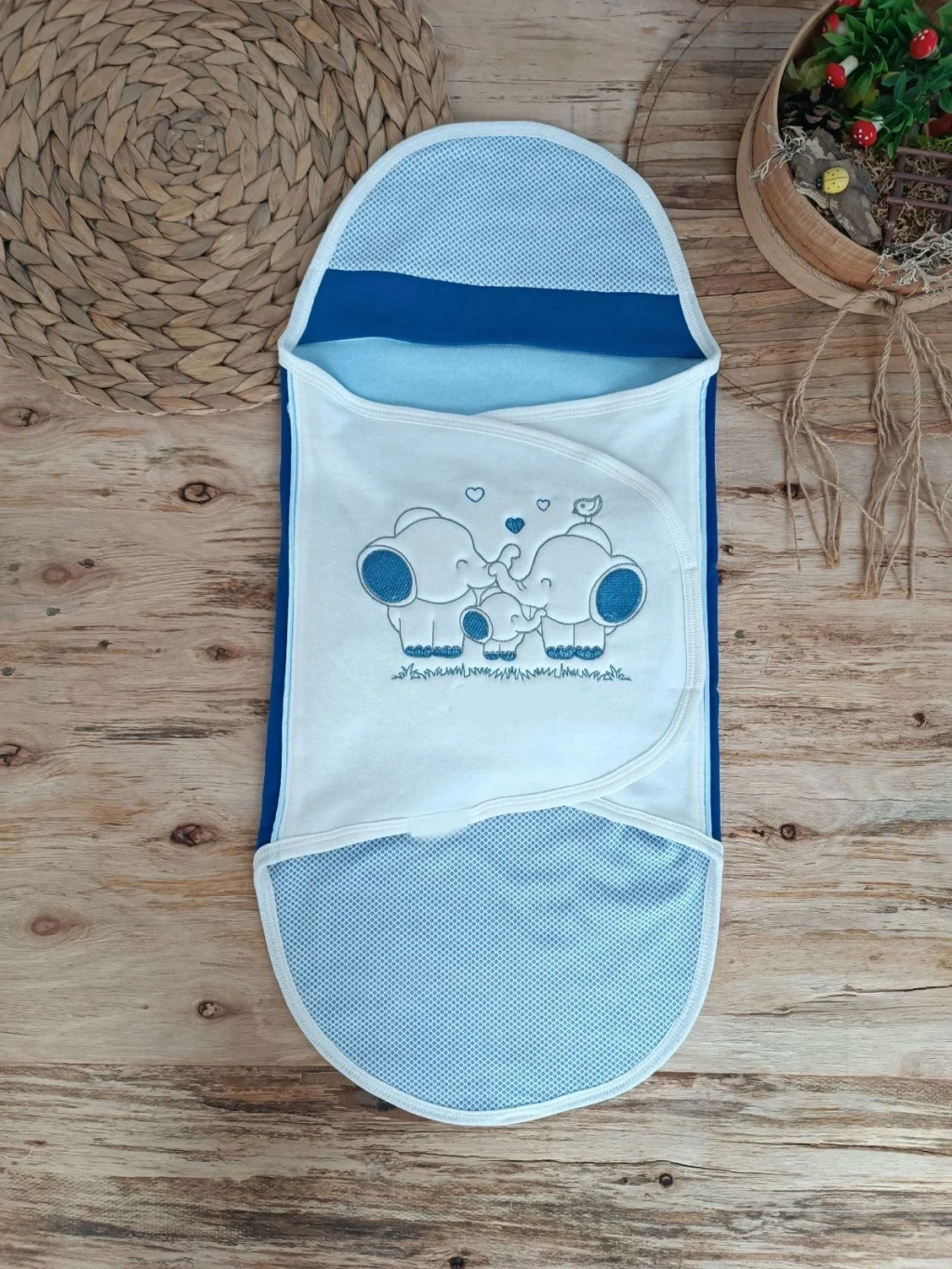 Yenidoğan Mutlu Fil Ailesi Nakışlı Çıt Çıt Kapamalı Bebek Kundak Lacivert