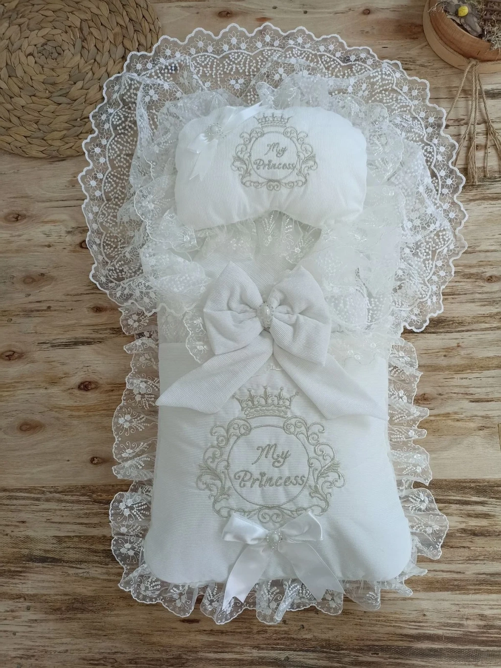 Yenidoğan Nil Taç Nakışlı Hayal Güpürlü Trilüks Kundak Bebek Battaniyesi 3lü Alt Açma Seti Bej