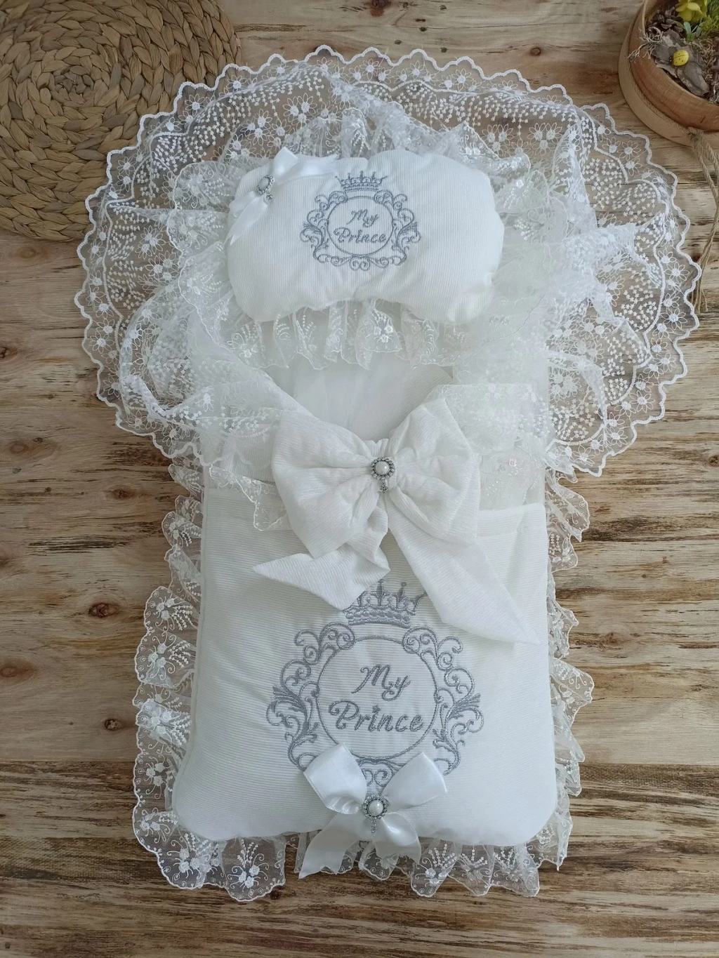 Yenidoğan Nil Taç Nakışlı Hayal Güpürlü Trilüks Kundak Bebek Battaniyesi 3lü Alt Açma Seti Gri