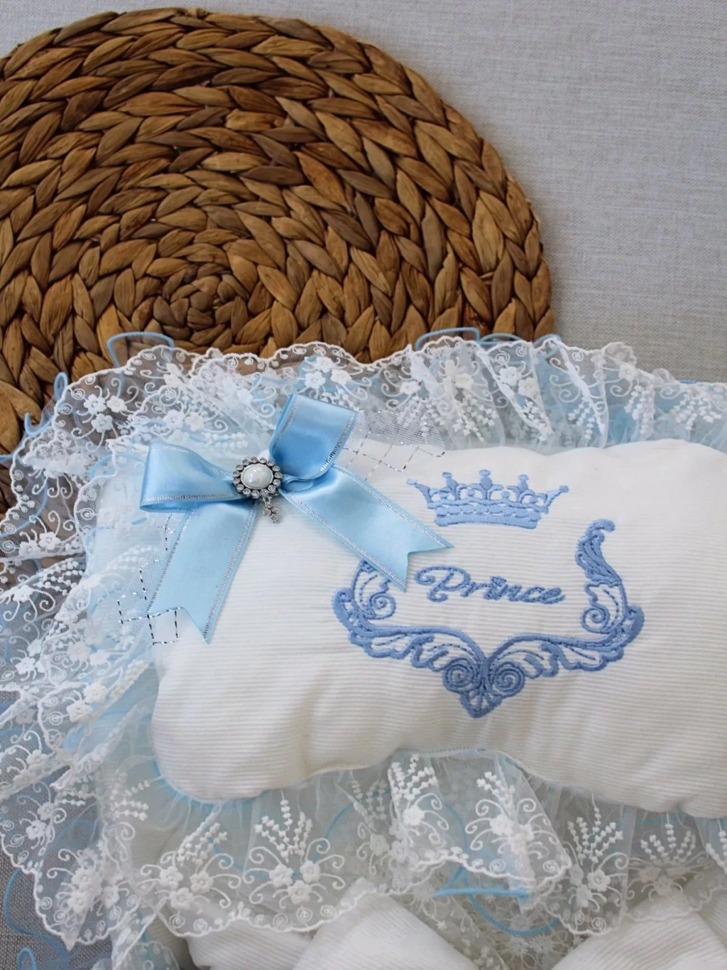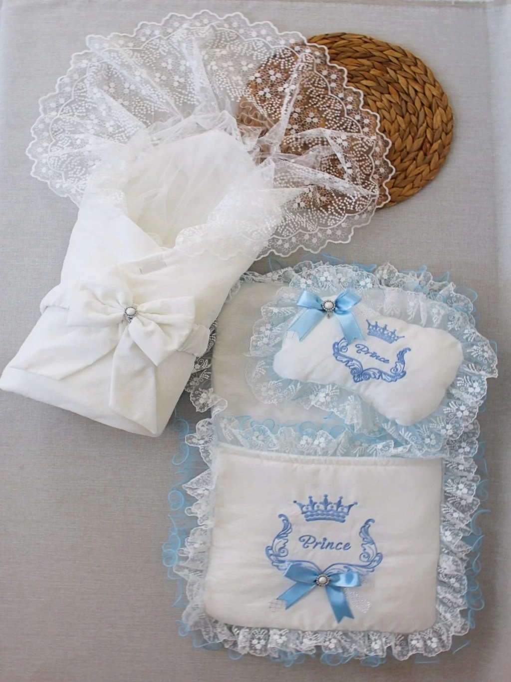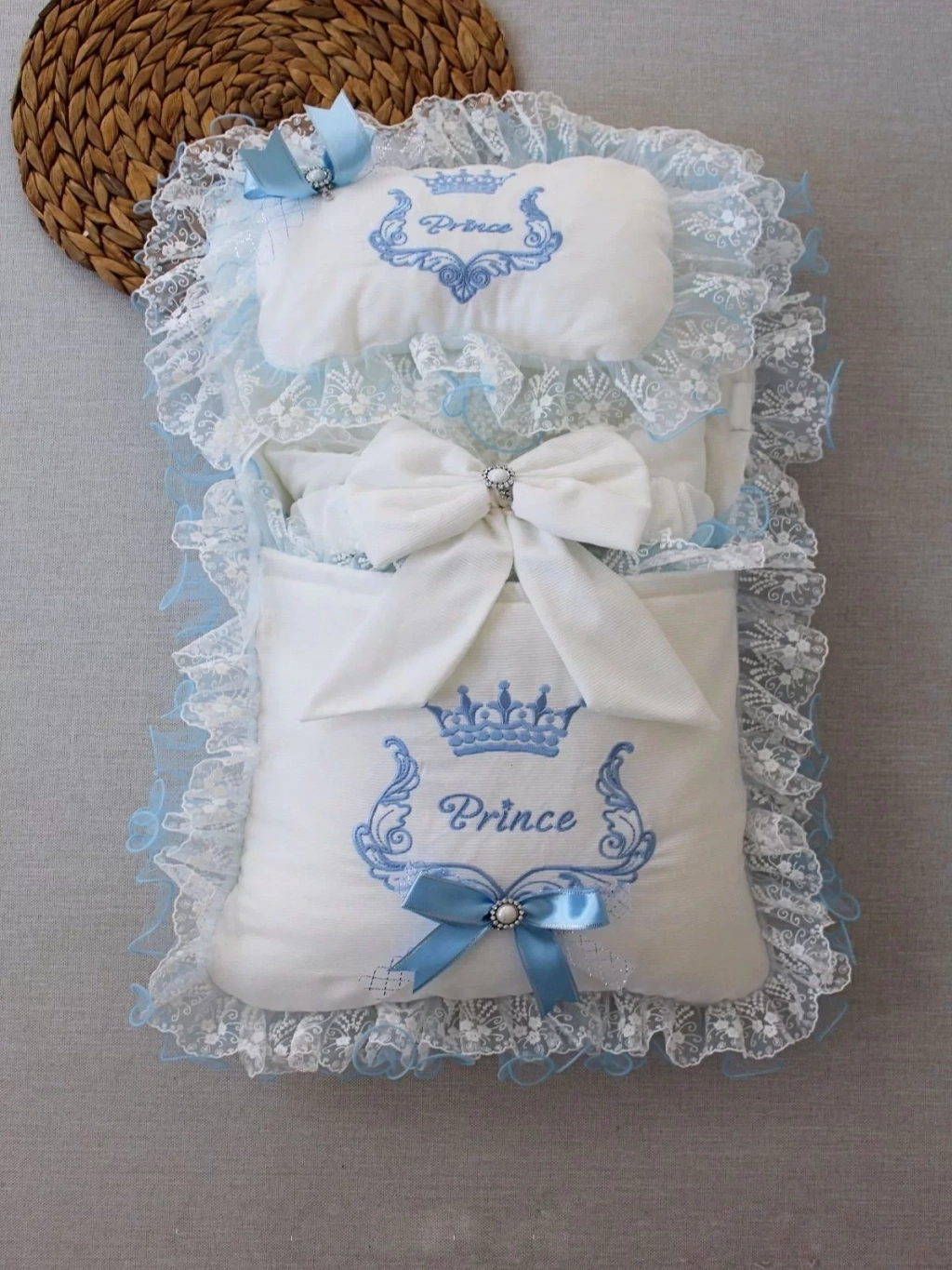 Yenidoğan Nil Taç Nakışlı Kundaklı Trilüks 3lü Alt Açma Seti Mavi