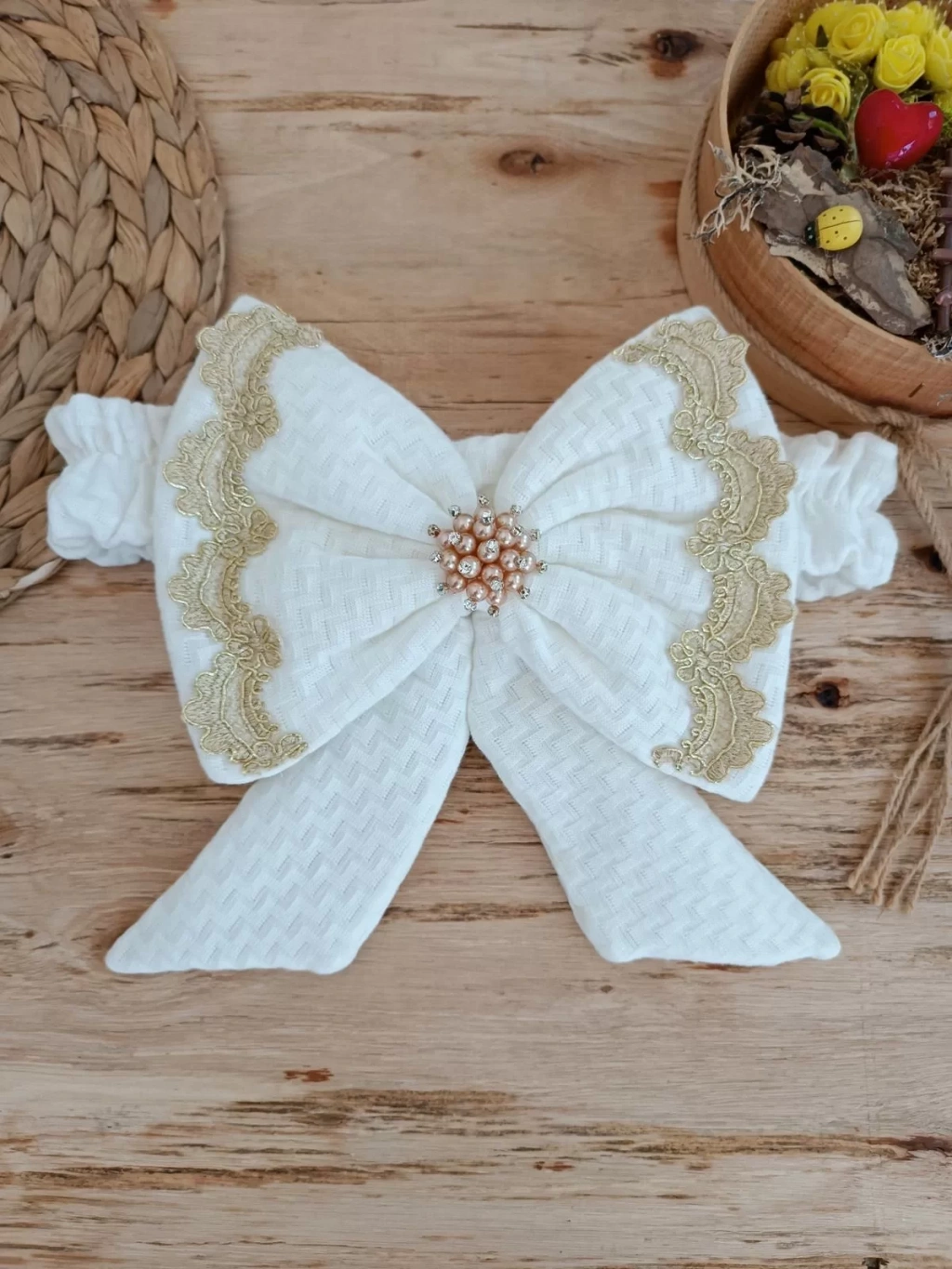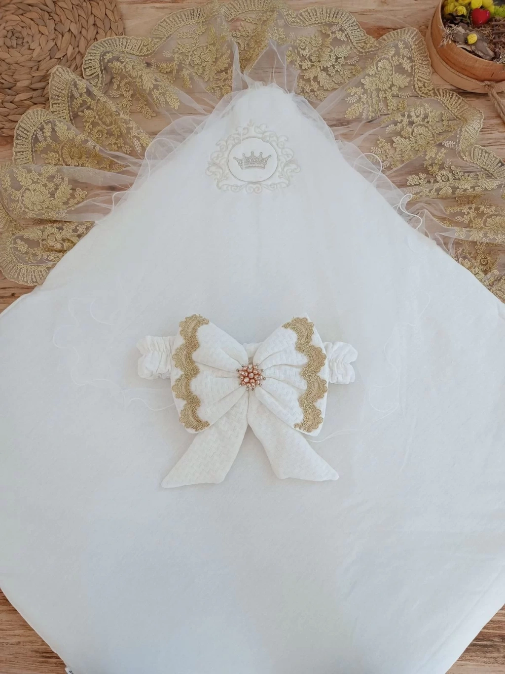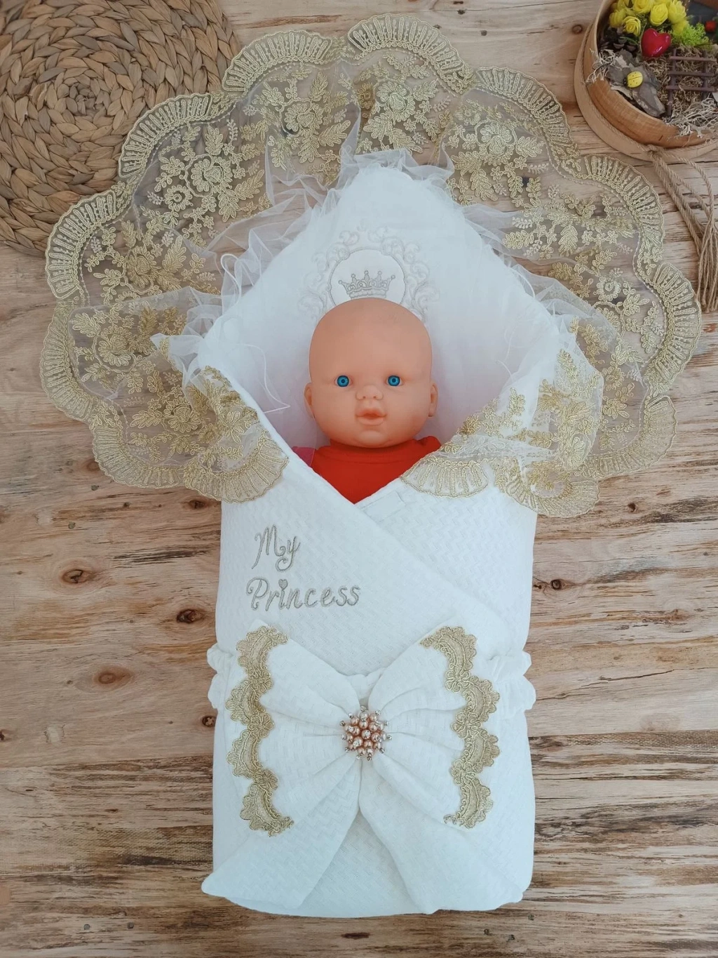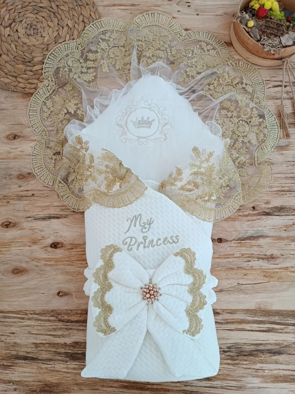 Yenidoğan Pamuk Taç Benim Prensesim Nakışlı Trilüks Kundak Bebek Battaniyesi Ekru