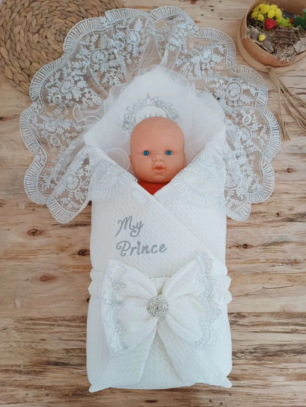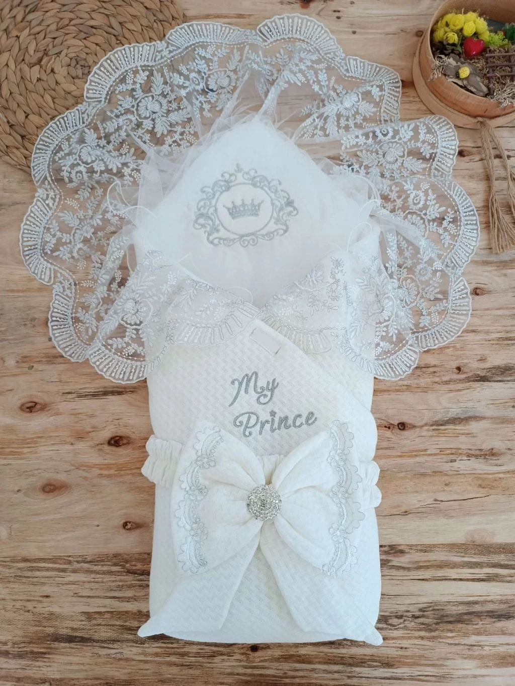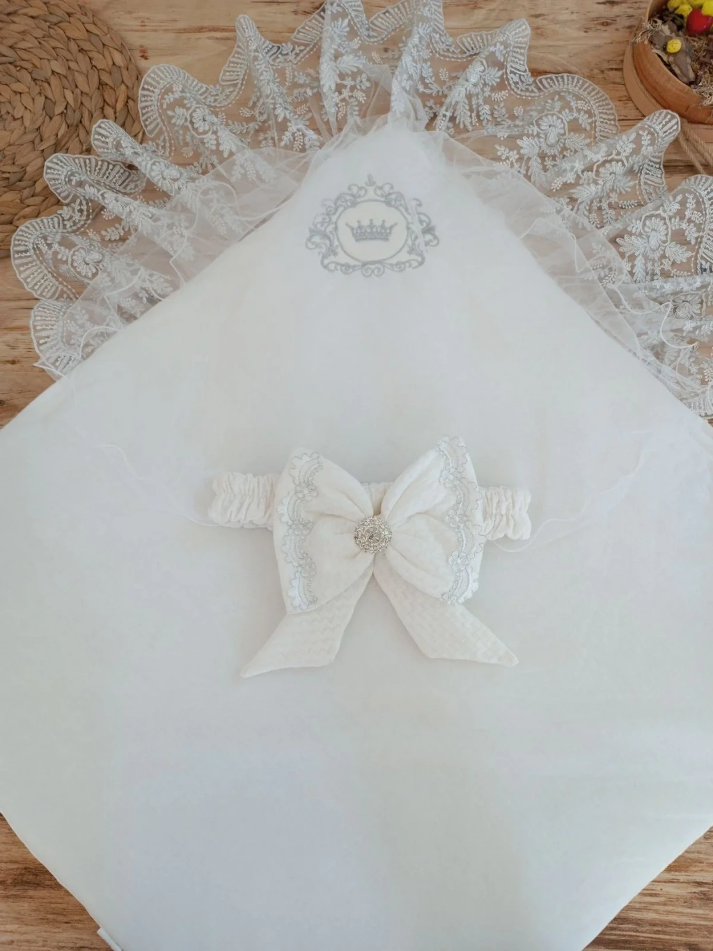 Yenidoğan Pamuk Taç Benim Prensim Nakışlı Trilüks Kundak Bebek Battaniyesi Ekru