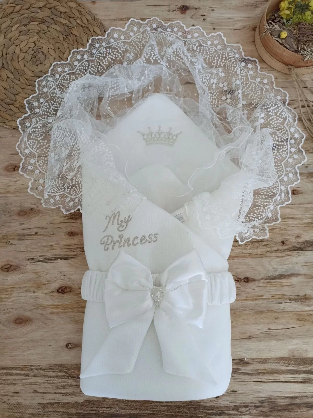 Yenidoğan Sahra Taç Benim Prensesim Nakışlı Kundak Bebek Battaniyesi Ekru