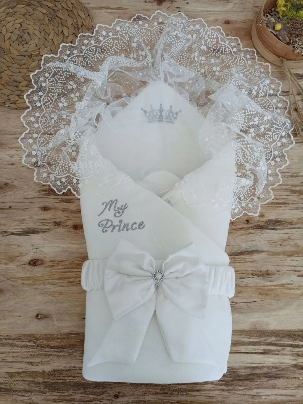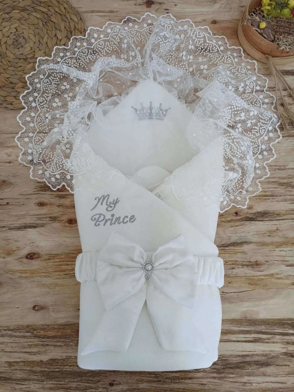 Yenidoğan Sahra Taç Benim Prensim Nakışlı Kundak Bebek Battaniyesi Ekru