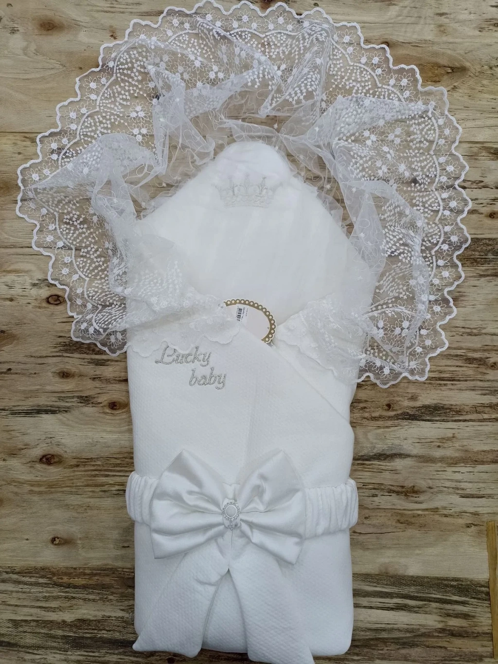 Yenidoğan Sahra Taç Lucky Baby Nakışlı Kumru Kundak Bebek Battaniyesi Ekru