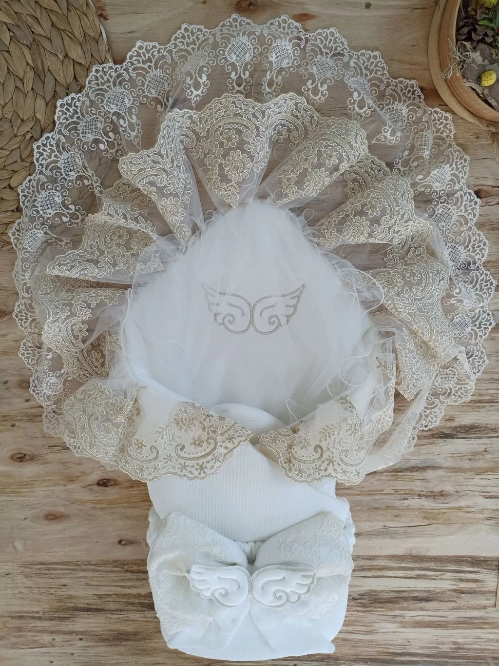 Yenidoğan Sahra Taç Nakışlı Gold Angel Trilüks Kundak Bebek Battaniyesi Ekru