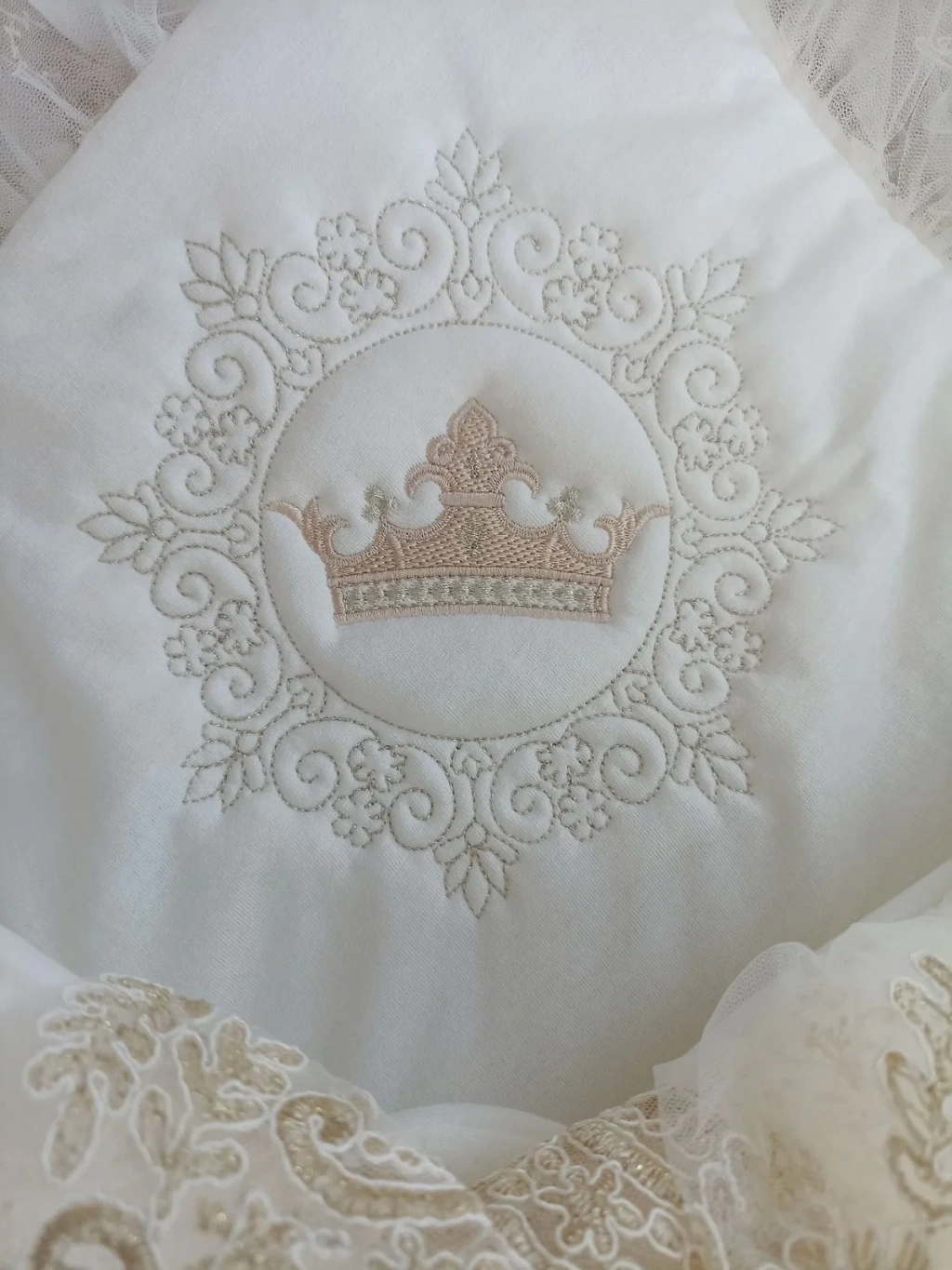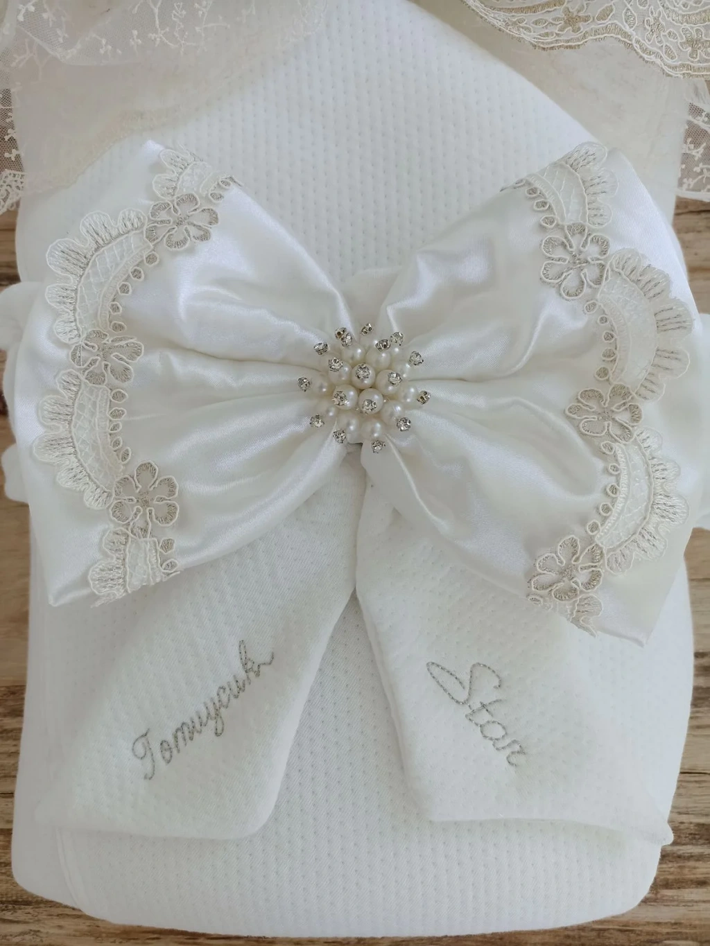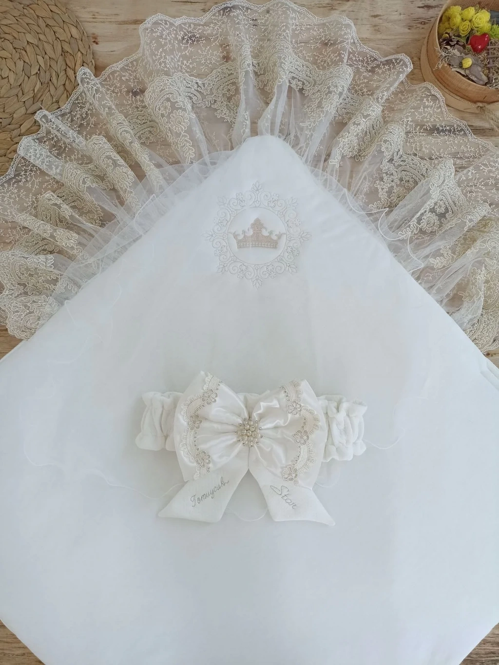 Yenidoğan Sahra Taç Nakışlı Plazma Taşlı Güpürlü Fiyonklu Duvaklı Trilüks Kundak Bebek Battaniyesi Ekru