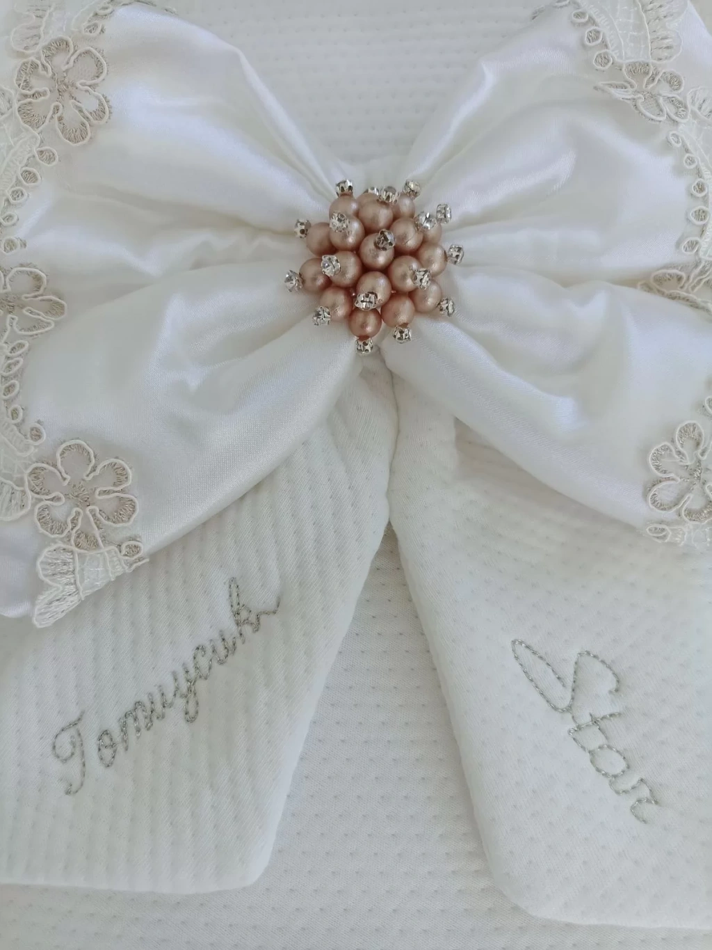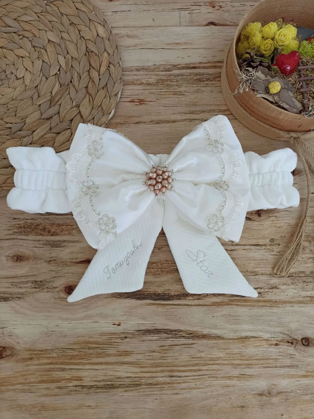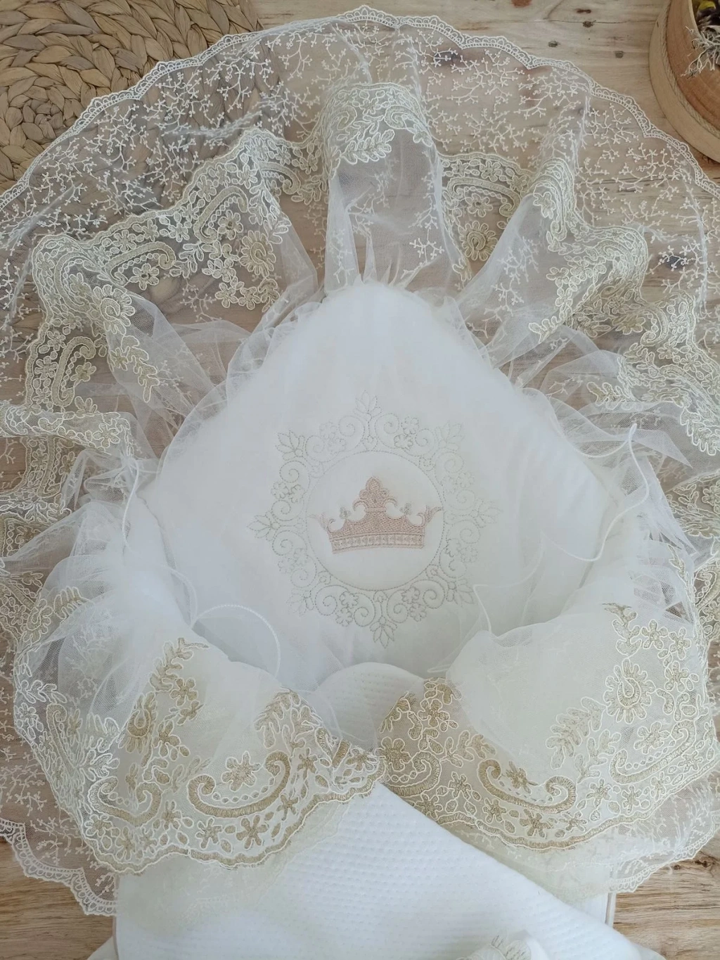 Yenidoğan Sahra Taç Nakışlı Plazma Taşlı Güpürlü Fiyonklu Duvaklı Trilüks Kundak Bebek Battaniyesi Sütlü Kahve