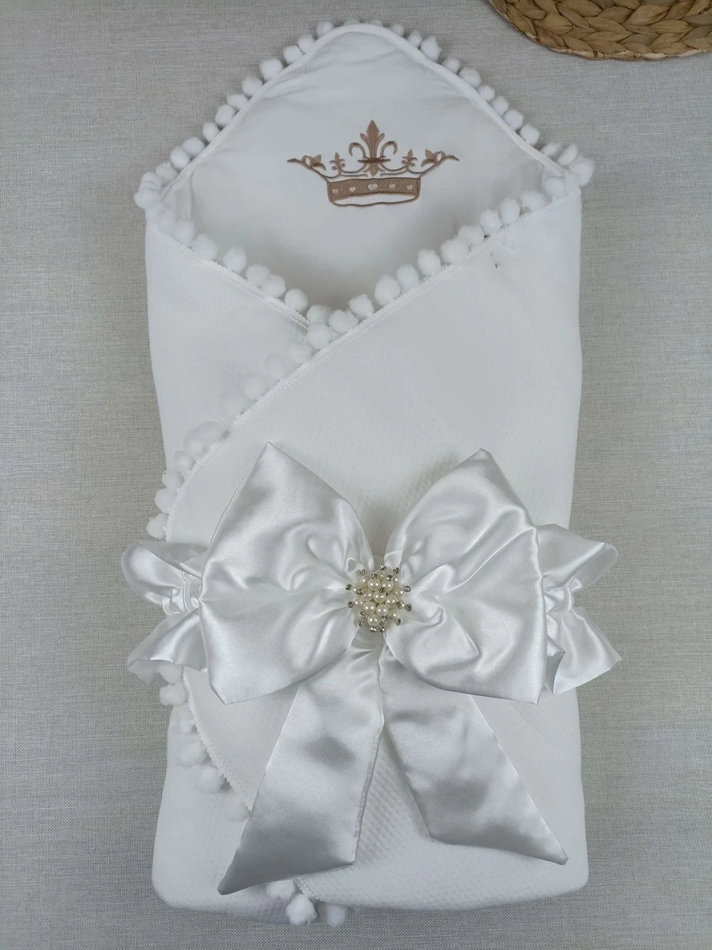 Yenidoğan Sahra Taç Nakışlı Topçik Kenar Lüks Kundak Bebek Battaniyesi Ekru