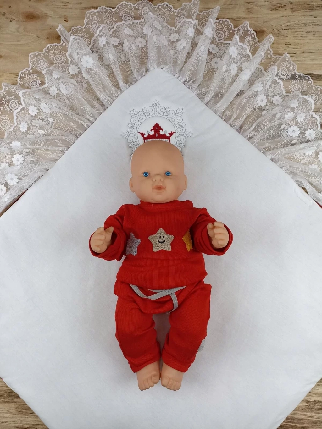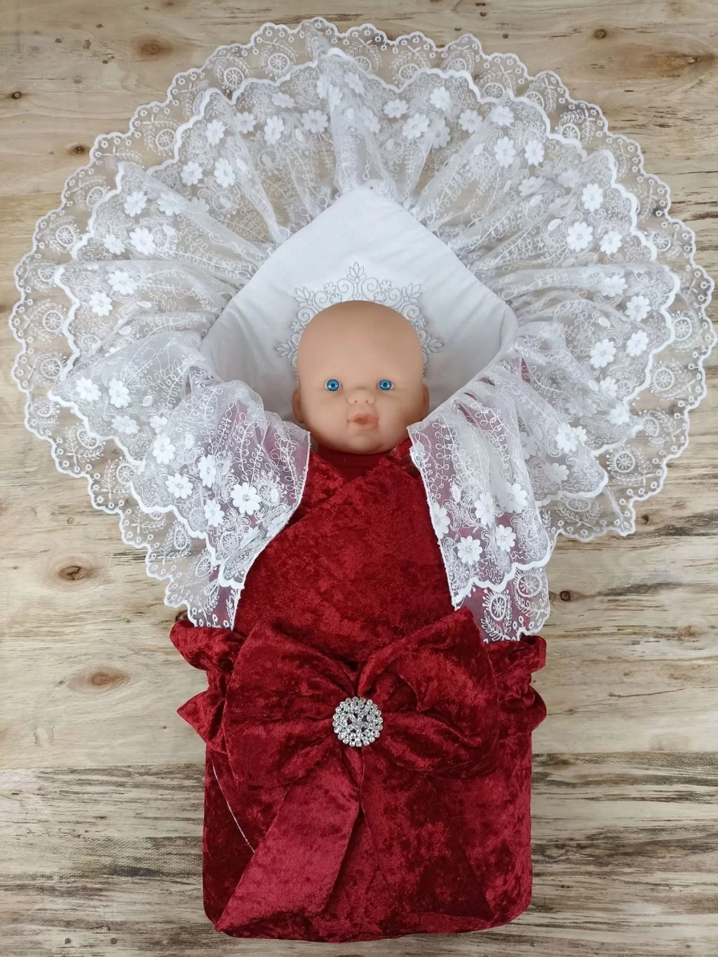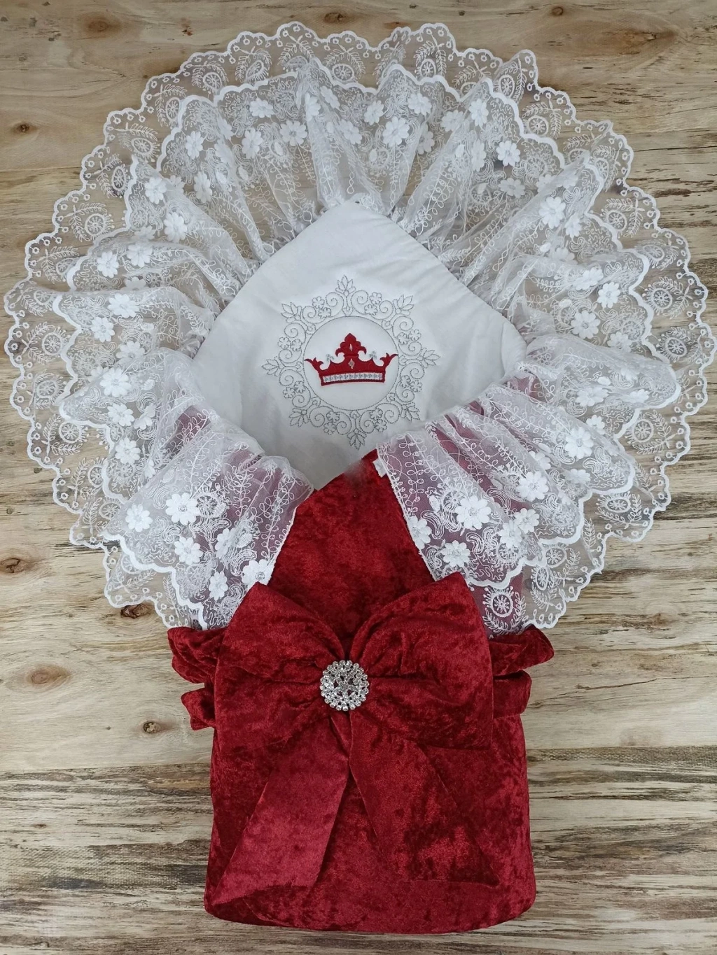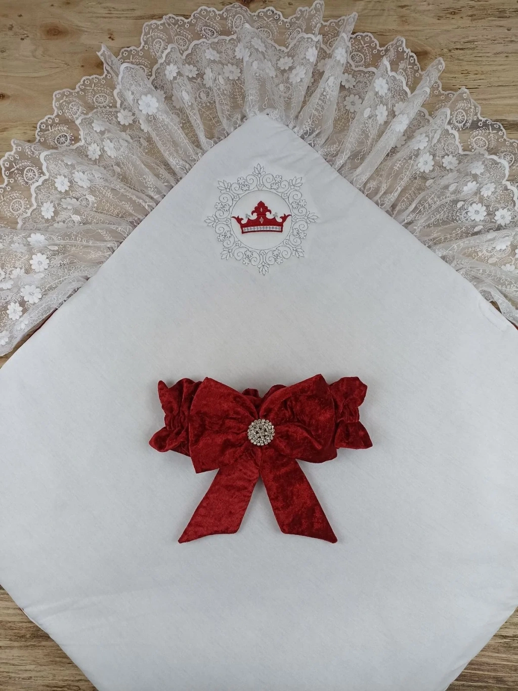 Yenidoğan Saray Kadife Taç Nakışlı İnci Fiyonklu Çift Dantel Duvak Trilüks Kundak Bebek Battaniyesi Bordo