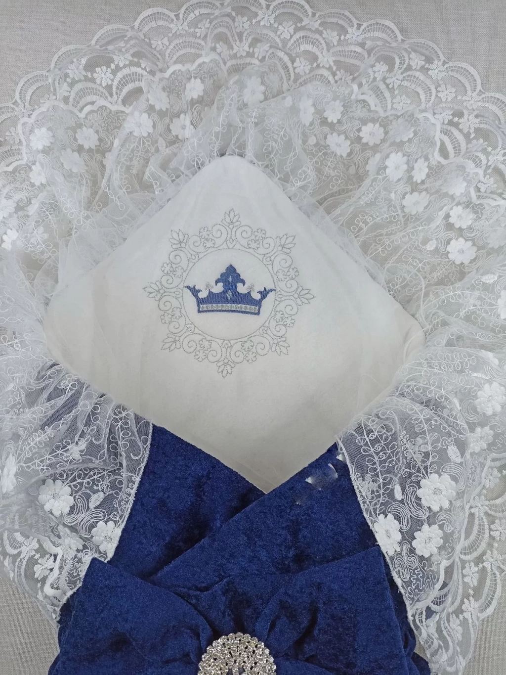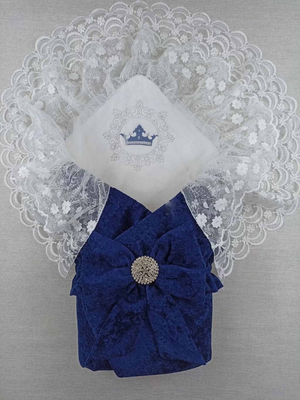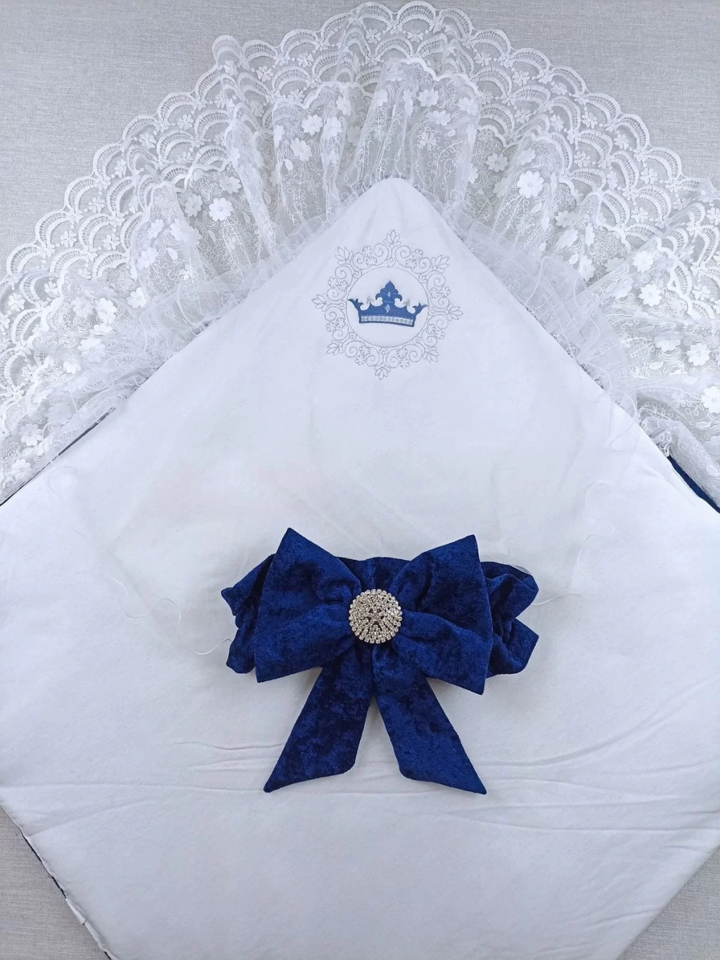Yenidoğan Saray Kadife Taç Nakışlı İnci Fiyonklu Çift Dantel Duvak Trilüks Kundak Bebek Battaniyesi Lacivert