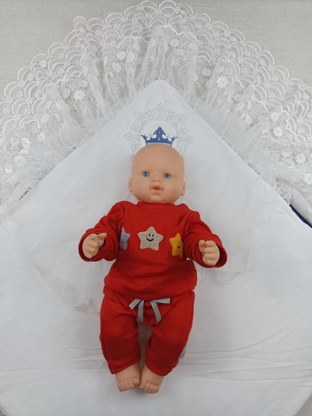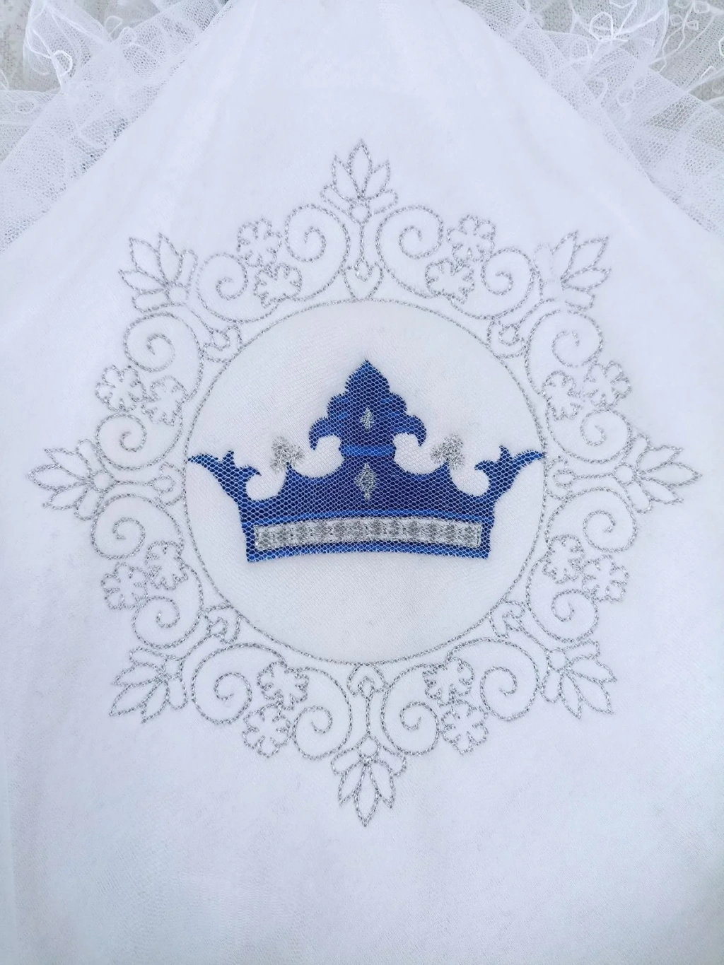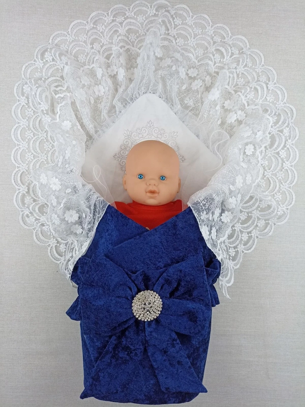 Yenidoğan Saray Kadife Taç Nakışlı İnci Fiyonklu Çift Dantel Duvak Trilüks Kundak Bebek Battaniyesi Lacivert