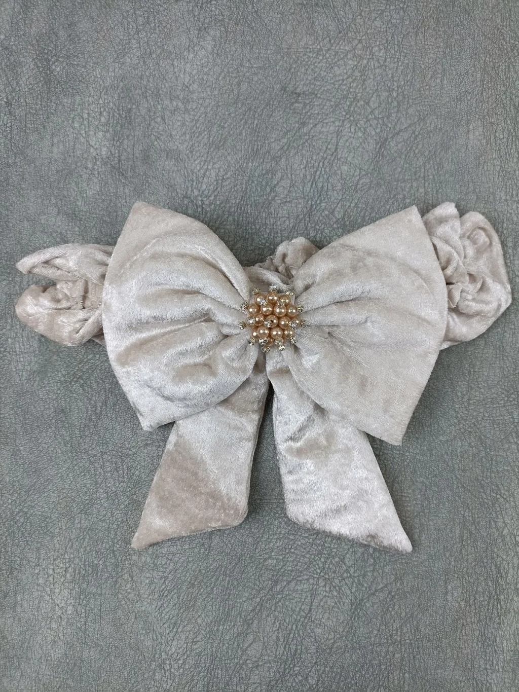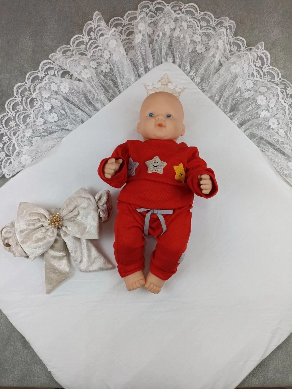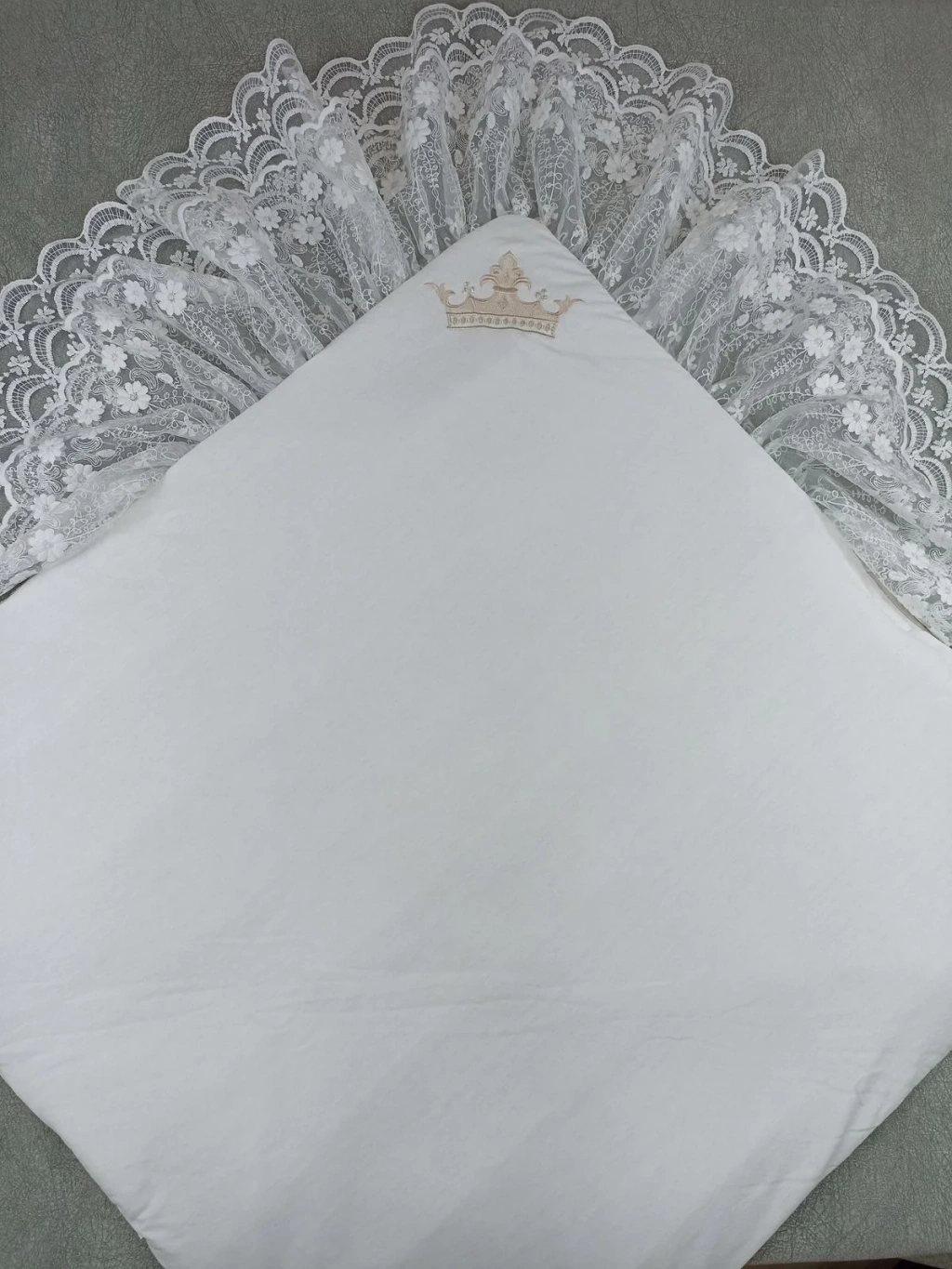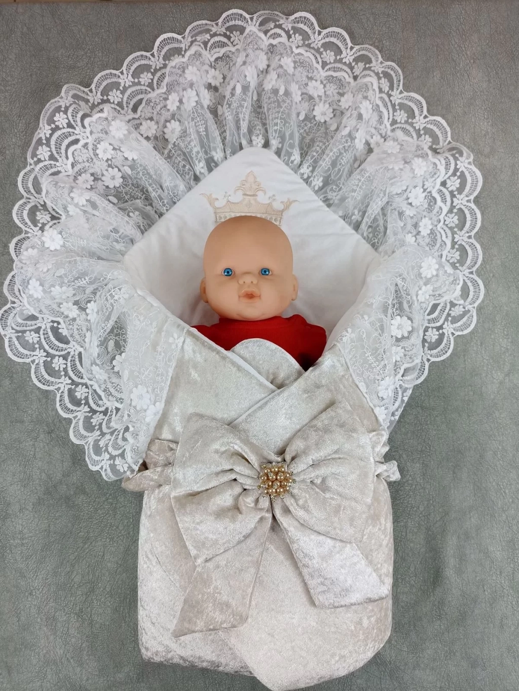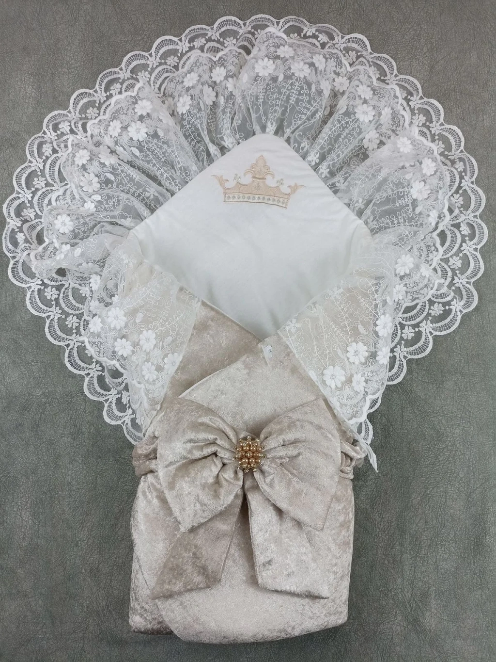Yenidoğan Saray Kadife Taç Nakışlı İnci Fiyonklu Çift Dantel Duvak Trilüks Kundak Bebek Battaniyesi Vizon-ekru