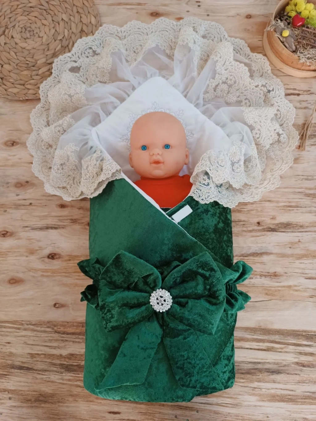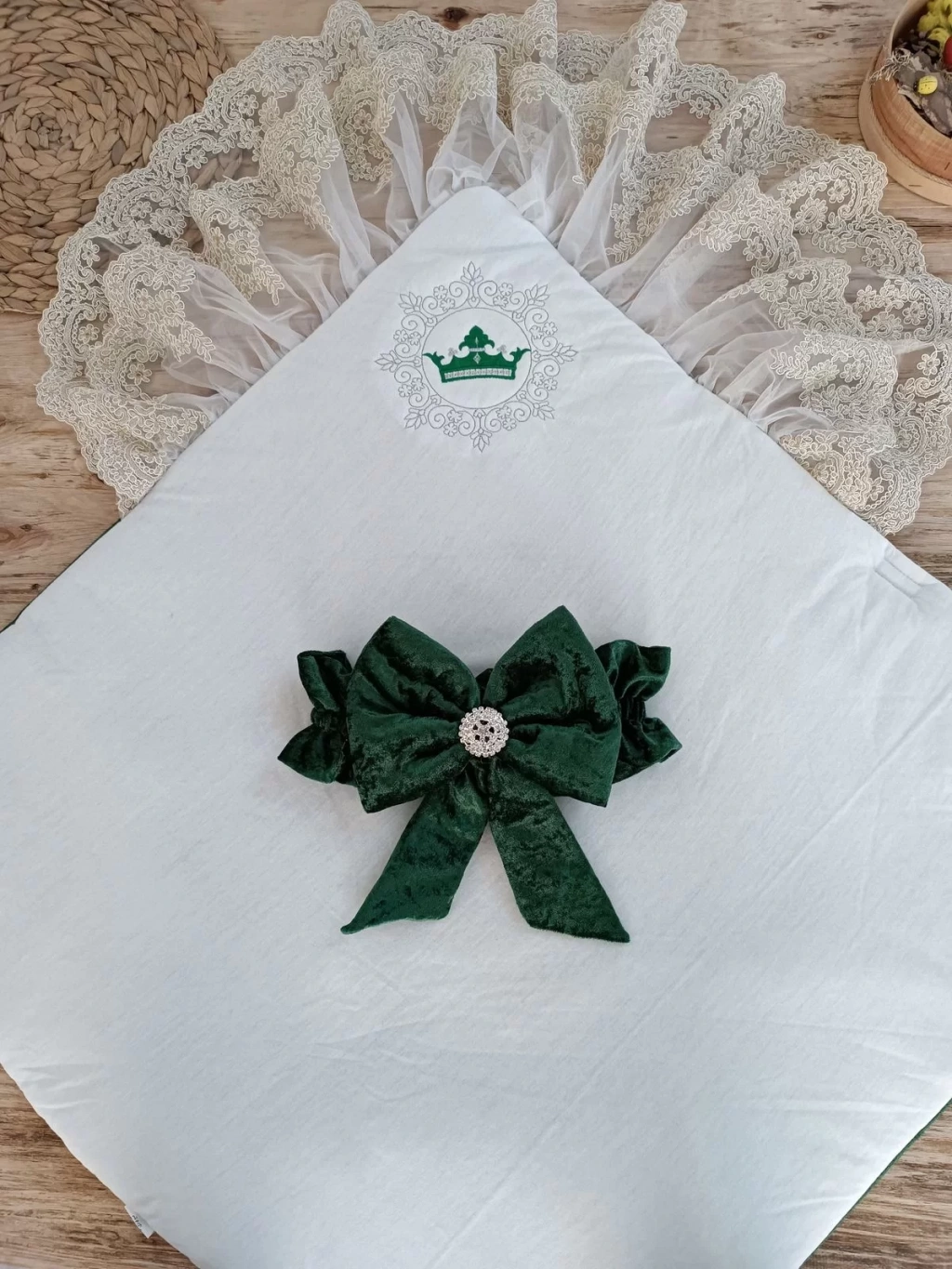Yenidoğan Saray Kadife Taç Nakışlı İnci Fiyonklu Çift Dantel Duvak Trilüks Kundak Bebek Battaniyesi Yeşil