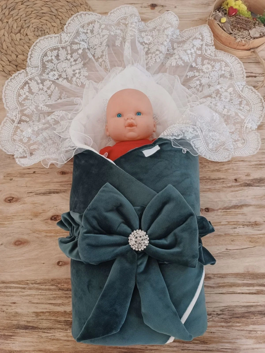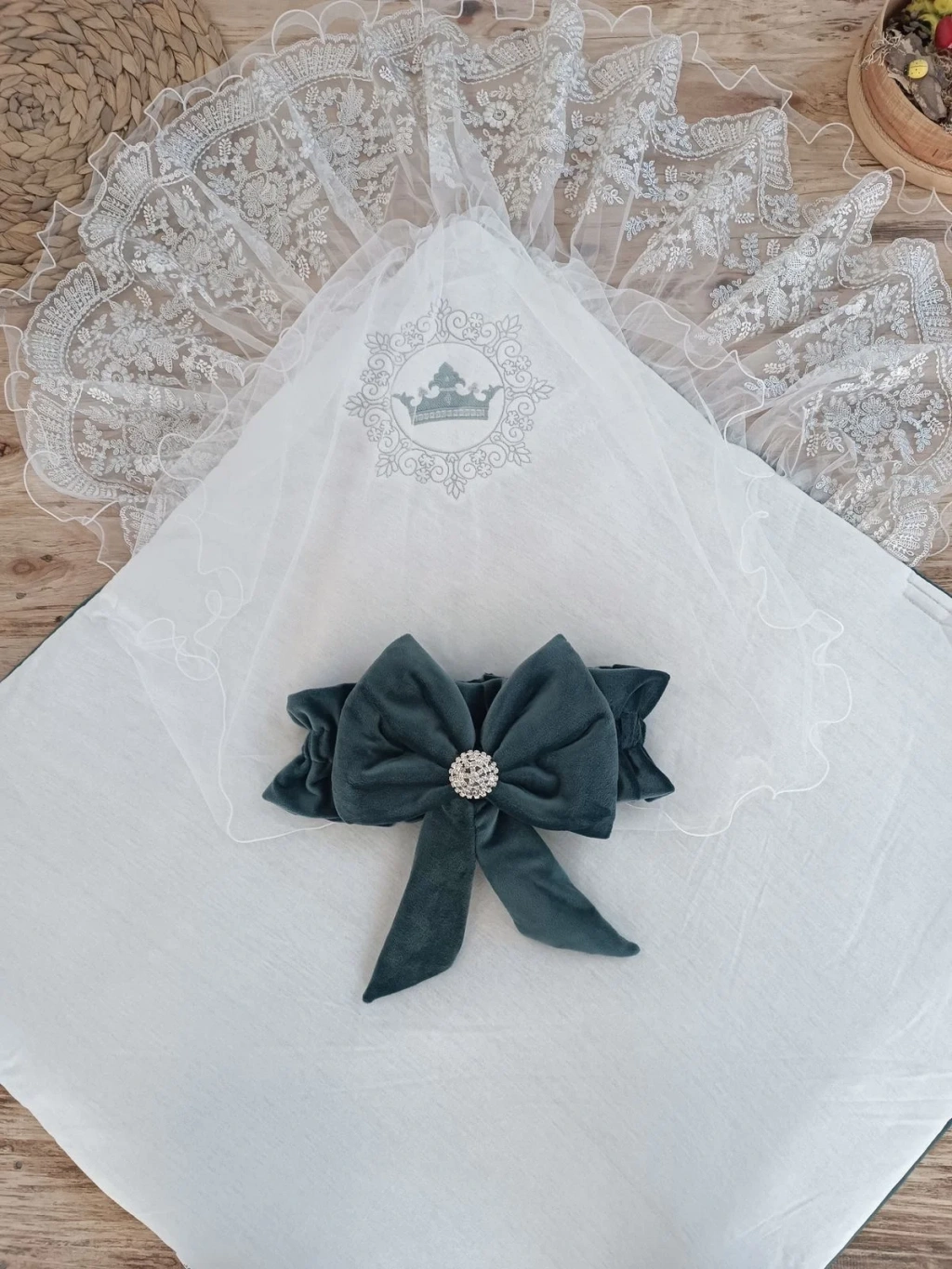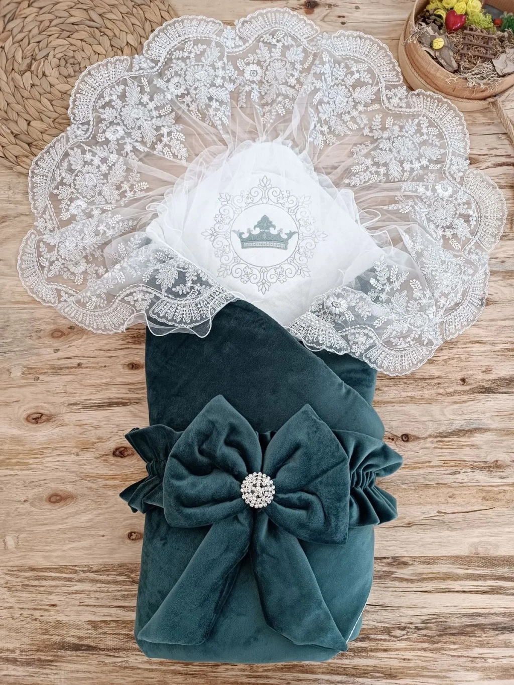 Yenidoğan Saray Kadife Taç Nakışlı İnci Fiyonklu Dantel Duvak Trilüks Kundak Bebek Battaniye Yeşil