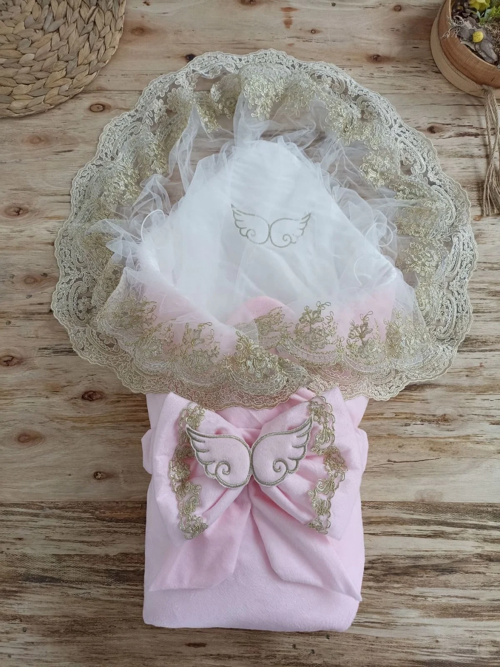 Yenidoğan Soft Kumru Melek Kanat Fiyonklu Gold Çift Dantel Duvaklı Trilüks Kundak Bebek Battaniyesi Pembe