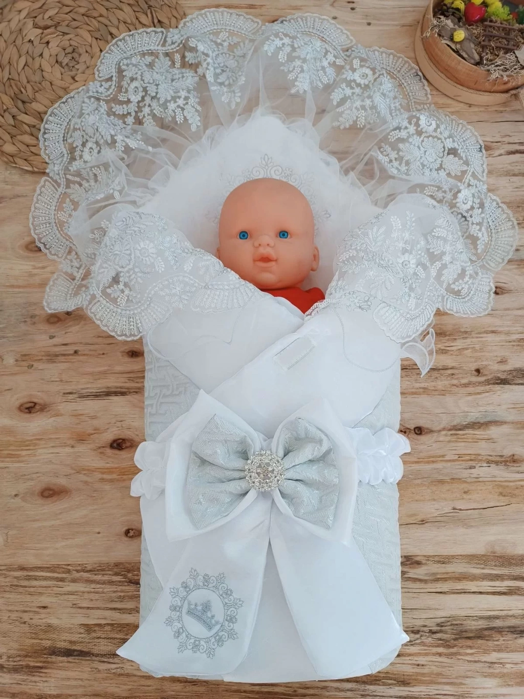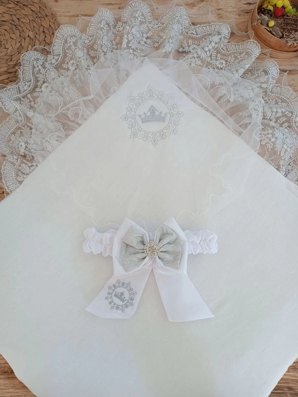 Yenidoğan Titi Taç Nakışlı Plazma Taşlı Güpürlü Çift Fiyonk Duvaklı Trilüks Kundak Bebek Battaniyesi Gümüş