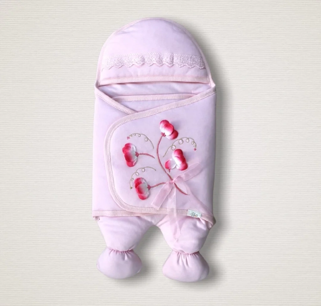 Yenidoğan Yapay Çiçek İşlemeli Şapkalı Lüks Kız Bebek Ayaklı Kundak Bebek Battaniyesi Pembe