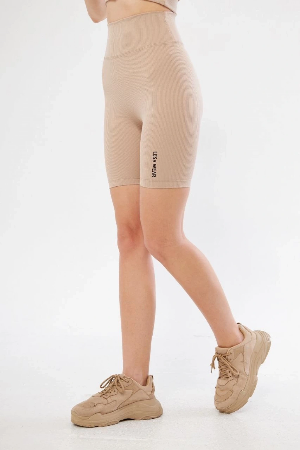 Yüksek Bel Fitilli Biker Baskılı Şort - Bej
